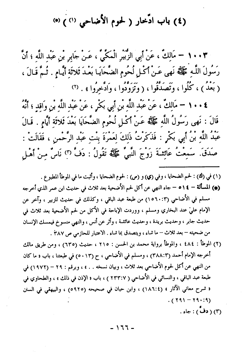 1003 - مَالِكٌ، عَنْ أَبِي الزُّبَيْرِ الْمَكِّيِّ، عَنْ جَابِرِ بْنِ عَبْدِ اللَّهِ أَنَّ رَسُولَ اللَّهِ - صَلَّى اللَّهُ عَلَيْهِ وَسَلَّمَ - نَهَى عَنْ أَكْلِ لُحُومِ الضَّحَايَا بَعْدَ ثَلَاثَةِ أَيَّامٍ، ثُمَّ قَالَ بَعْدُ، كُلُوا، وَتَصَدَّقُوا، وَتَزَوَّدُوا، وَادَّخِرُوا.