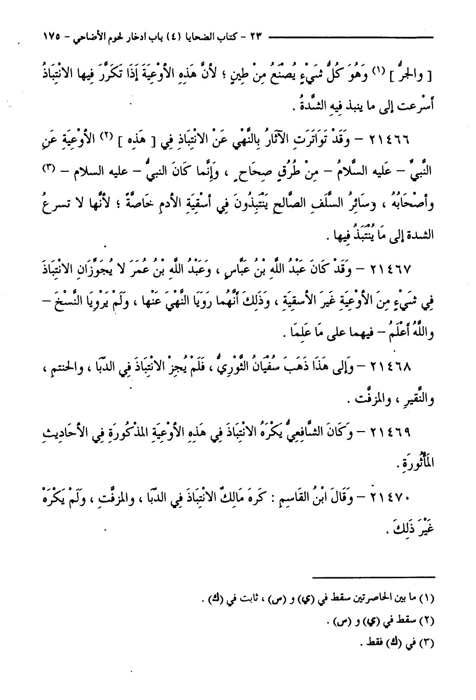 21466 - وَقَدْ تَوَاتَرَتِ الْآثَارُ بِالنَّهْيِ عَنِ الِانْتِبَاذِ فِي هَذِهِ الْأَوْعِيَةِ عَنِ النَّبِيِّ - عَلَيْهِ السَّلَامُ - مِنْ طُرُقٍ صِحَاحٍ، وَإِنَّمَا كَانَ النَّبِيُّ - عَلَيْهِ السَّلَامُ - وَأَصْحَابُهُ، وَسَائِرُ السَّلَفِ الصَّالِحِ يَنْتَبِذُونَ فِي أَسْقِيَةِ الْأُدُمِ خَاصَّةً ; لِأَنَّهَا لَا تُسْرِعُ الشِّدَّةُ إِلَى مَا يُنْتَبَذُ فِيهَا.