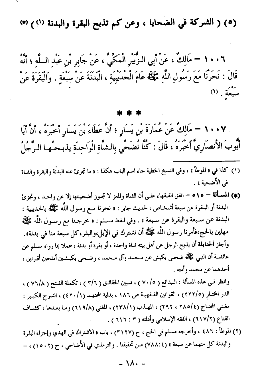 1006 - مَالِكٌ، عَنْ أَبِي الزُّبَيْرِ الْمَكِّيِّ، عَنْ جَابِرِ بْنِ عَبْدِ اللَّهِ أَنَّهُ قَالَ: نَحَرْنَا مَعَ رَسُولِ اللَّهِ - صَلَّى اللَّهُ عَلَيْهِ وَسَلَّمَ - عَامَ الْحُدَيْبِيَةِ، الْبَدَنَةَ عَنْ سَبْعَةٍ. وَالْبَقَرَةَ عَنْ سَبْعَةِ.