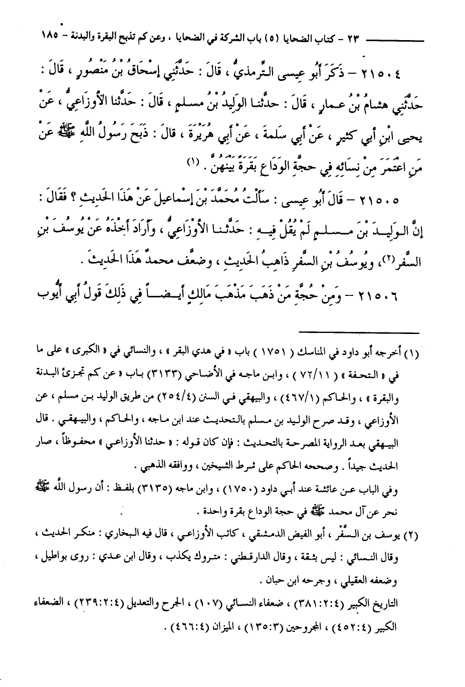 21504 - ذَكَرَ أَبُو عِيسَى التِّرْمِذِيُّ، قَالَ: حَدَّثَنِي إِسْحَاقُ بْنُ مَنْصُورٍ، قَالَ: حَدَّثَنِي هِشَامُ بْنُ عَمَّارٍ، قَالَ: حَدَّثَنَا الْوَلِيدُ بْنُ مُسْلِمٍ، قَالَ: حَدَّثَنَا الْأَوْزَاعِيُّ، عَنْ يَحْيَى بْنِ أَبِي كَثِيرٍ، عَنْ أَبِي سَلَمَةَ، عَنْ أَبِيَ هُرَيْرَةَ، قَالَ: ذَبَحَ رَسُولُ اللَّهِ - صَلَّى اللَّهُ عَلَيْهِ وَسَلَّمَ - عَمَّنِ اعْتَمَرَ مِنْ نِسَائِهِ فِي حَجَّةِ الْوَدَاعِ بَقَرَةً بَيْنَهُنَّ.