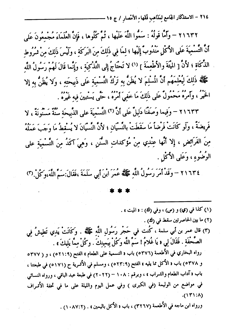 21634 - وَقَدْ أَمَرَ رَسُولُ اللَّهِ - صَلَّى اللَّهُ عَلَيْهِ وَسَلَّمَ - عُمَرَ بْنَ أَبِي سَلَمَةَ، فَقَالَ: سَمِّ اللَّهَ، وَكُلْ.