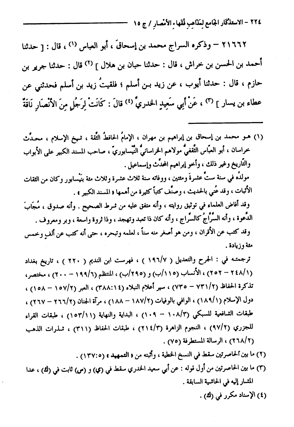 21662 - وَذَكَرَهُ - السَّرَّاجُ مُحَمَّدُ بْنُ إِسْحَاقَ أَبُو الْعَبَّاسِ، قَالَ: حَدَّثَنَا أَحْمَدُ بْنُ الْحَسَنِ بْنِ خِرَاشٍ، قَالَ: حَدَّثَنَا حَبَّانُ بْنُ هِلَالٍ، قَالَ: حَدَّثَنَا جَرِيرُ بْنُ حَازِمٍ، قَالَ: حَدَّثَنَا أَيُّوبُ، عَنْ زَيْدِ بْنِ أَسْلَمَ فَلَقِيتُ زَيْدَ بْنَ أَسْلَمَ فَحَدَّثَنِي عَنْ عَطَاءِ بْنِ يَسَارٍ، عَنْ أَبِي سَعِيدٍ الْخُدْرِيِّ قَالَ: كَانَتْ لِرَجُلٍ مِنَ الْأَنْصَارِ نَاقَةٌ