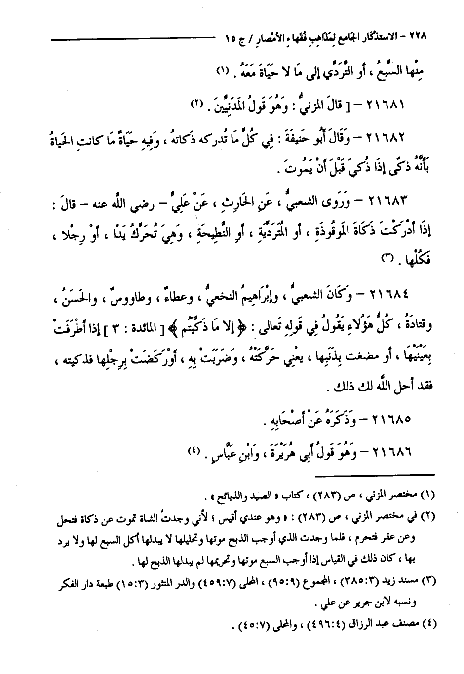 21684 - وَكَانَ الشَّعْبِيُّ، وَإِبْرَاهِيمُ النَّخَعِيُّ، وَعَطَاءٌ، وَطَاوُسٌ، وَالْحَسَنُ، وَقَتَادَةُ، كُلُّ هَؤُلَاءِ يَقُولُ فِي قَوْلِهِ تَعَالَى:إِلَّا مَا ذَكَّيْتُمْ [ الْمَائِدَةِ: 3 ] إِذَا أَطْرَفَتْ بِعَيْنَيْهَا، أَوْ مَصَعَتْ بِذَنَبِهَا، يَعْنِي حَرَّكَتْهُ، وَضَرَبَتْ بِهِ، أَوْ رَكَضَتْ بِرِجْلِهَا فَذَكَّيْتَهُ، فَقَدْ أَحَلَّ اللَّهُ لَكَ ذَلِكَ.