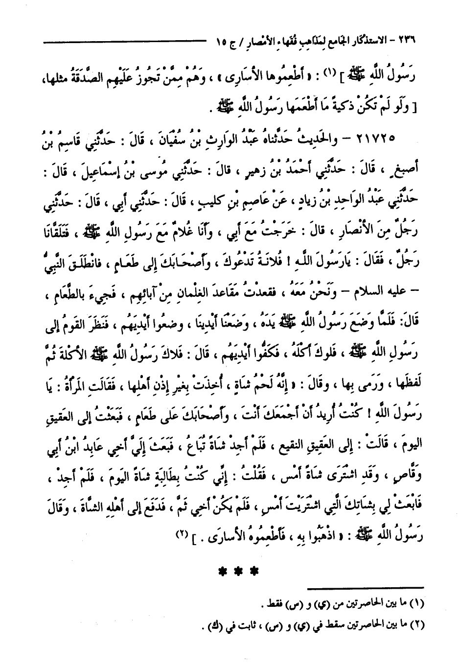 21725 - وَالْحَدِيثُ حَدَّثَنَاهُ عَبْدُ الْوَارِثِ بْنُ سُفْيَانَ، قَالَ: حَدَّثَنِي قَاسِمُ بْنُ أَصْبَغَ، قَالَ: حَدَّثَنِي أَحْمَدُ بْنُ زُهَيْرٍ، قَالَ: حَدَّثَنِي مُوسَى بْنُ إِسْمَاعِيلَ، قَالَ: حَدَّثَنِي عَبْدُ الْوَاحِدِ بْنُ زِيَادٍ، عَنْ عَاصِمِ بْنِ كُلَيْبٍ، قَالَ: حَدَّثَنِي أَبِي، قَالَ: حَدَّثَنِي رَجُلٌ مِنَ الْأَنْصَارِ، قَالَ: خَرَجْتُ مَعَ أَبِي، وَأَنَا غُلَامٌ مَعَ رَسُولِ اللَّهِ - صَلَّى اللَّهُ عَلَيْهِ وَسَلَّمَ - فَتَلَقَّانَا رَجُلٌ، فَقَالَ: يَا رَسُولَ اللَّهِ فُلَانَةٌ تَدْعُوكَ، وَأَصْحَابَكَ إِلَى طَعَامٍ، فَانْطَلَقَ النَّبِيُّ - عَلَيْهِ السَّلَامُ - وَنَحْنُ مَعَهُ، فَقَعَدْتُ مَقَاعِدَ الْغِلْمَانِ مِنْ آبَائِهِمْ، فَجِيءَ بِالطَّعَامِ، قَالَ: فَلَمَّا وَضَعَ رَسُولُ اللَّهِ - صَلَّى اللَّهُ عَلَيْهِ وَسَلَّمَ - يَدَهُ، وَضَعْنَا أَيَدِيَنَا، وَضَعُوا أَيْدِيَهُمْ، فَنَظَرَ الْقَوْمُ إِلَى رَسُولِ اللَّهِ - صَلَّى اللَّهُ عَلَيْهِ وَسَلَّمَ - فَلَوَكَ أَكْلَهُ، فَكَفُّوا أَيْدِيَهُمْ، قَالَ: فَلَاكَ رَسُولُ اللَّهِ - صَلَّى اللَّهُ عَلَيْهِ وَسَلَّمَ - الْأَكْلَةَ ثُمَّ لَفَظَهَا، وَرَمَى بِهَا، وَقَالَ: إِنَّهُ لَحْمُ شَاةٍ، أُخِذَتْ بِغَيْرِ إِذَنِ أَهْلِهَا، فَقَالَتِ الْمَرْأَةُ: يَا رَسُولَ اللَّهِ كُنْتُ أُرِيدُ أَنْ أَجْمَعَكَ أَنْتَ، وَأَصْحَابَكَ عَلَى طَعَامٍ، فَبَعَثْتُ إِلَى الْعَقِيقِ الْيَوْمَ، قَالَتْ: إِلَى الْعَقِيقِ النَّقِيعِ، فَلَمْ أَجِدْ شَاةً تُبَاعُ، فَبَعَثَ إِلَيَّ أَخِي عَابِدُ بْنُ أَبِي وَقَّاصٍ، وَقَدِ اشْتَرَى شَاةً أَمْسُ، فَقُلْتُ: إِنِّي كُنْتُ بِطَالِبَةٍ شَاةً الْيَوْمَ، فَلَمْ أَجِدْ، فَابْعَثْ لِي بِشَاتِكَ الَّتِي اشْتَرَيْتَ أَمْسُ، فَلَمْ يَكُنْ أَخِي ثَمَّ، فَدَفَعَ إِلَى أَهْلِهِ الشَّاةَ، وَقَالَ رَسُولُ اللَّهِ - صَلَّى اللَّهُ عَلَيْهِ وَسَلَّمَ: اذْهَبُوا بِهِ، فَأَطْعِمُوهُ الْأُسَارَى.