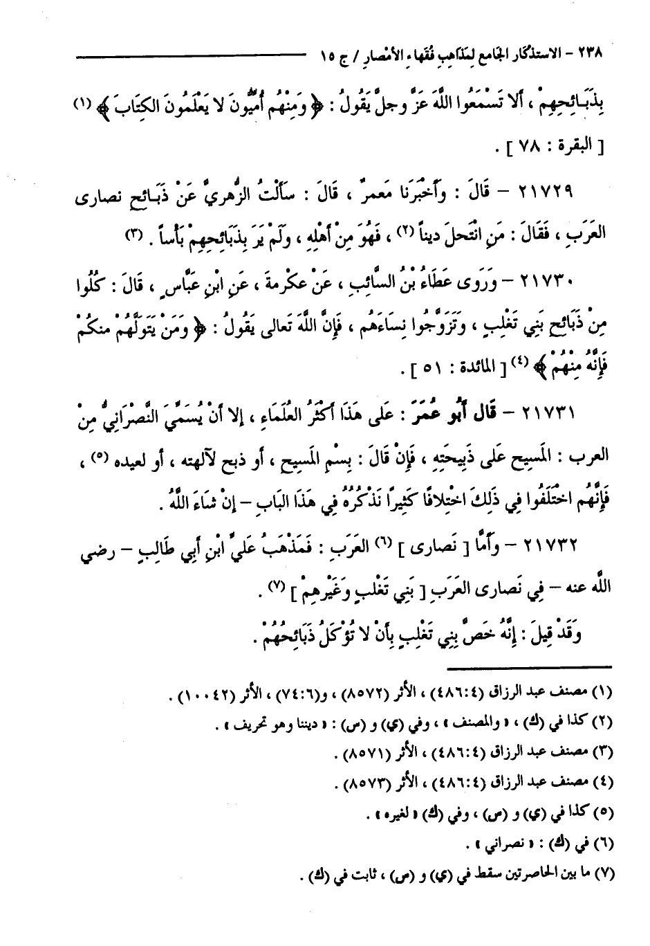 21729 - قَالَ: وَأَخْبَرَنَا مَعْمَرٌ، قَالَ: سَأَلْتُ الزُّهْرِيَّ عَنْ ذَبَائِحِ نَصَارَى الْعَرَبِ، فَقَالَ: مَنِ انْتَحَلَ دِينًا فَهُوَ مِنْ أَهْلِهِ، وَلَمْ يَرَ بِذَبَائِحِهِمْ بَأْسًا.