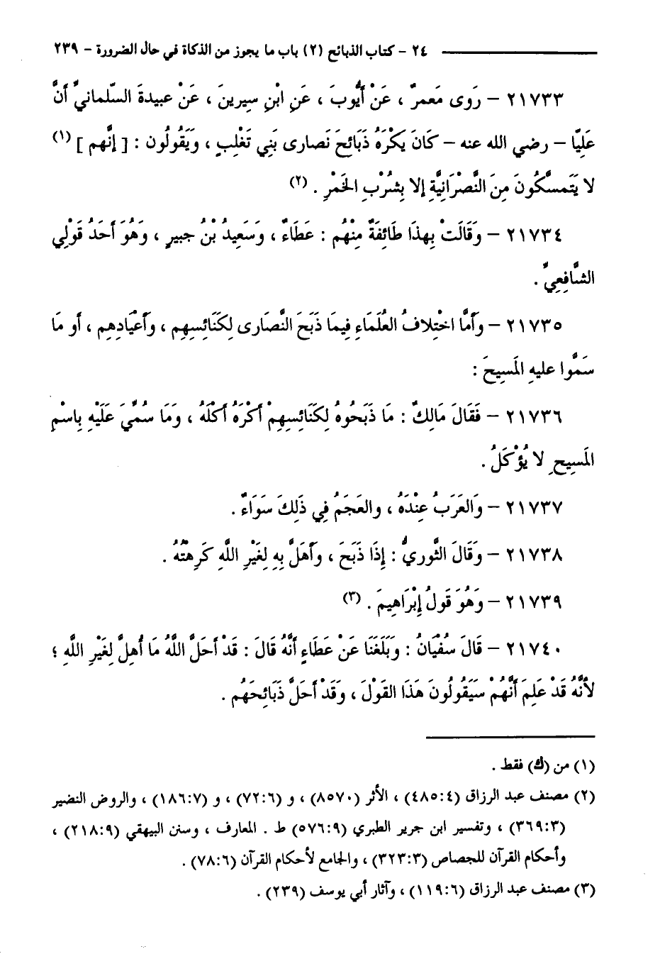 21733 - رَوَى مَعْمَرٌ، عَنْ أَيُّوبَ، عَنِ ابْنِ سِيرِينَ، عَنْ عَبِيدَةَ السَّلْمَانِيِّ أَنَّ عَلِيًّا - رَضِيَ اللَّهُ عَنْهُ - كَانَ يَكْرَهُ ذَبَائِحَ نَصَارَى بَنِي تَغْلِبَ، وَيَقُولُونَ: إِنَّهُمْ لَا يَتَمَسَّكُونَ مِنَ النَّصْرَانِيَّةِ إِلَّا بِشُرْبِ الْخَمْرِ.