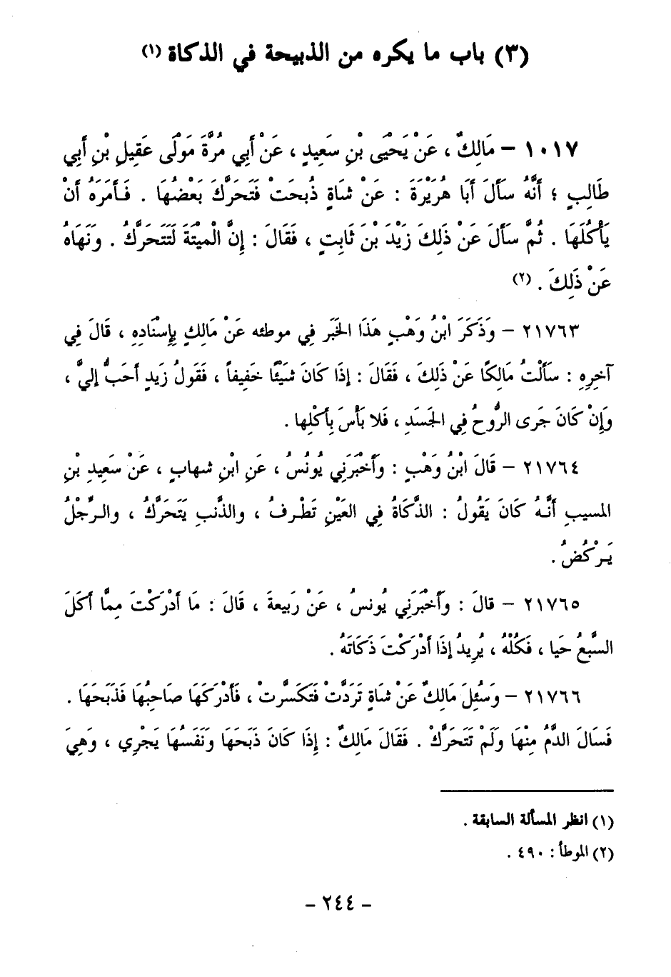 1017 - مَالِكٌ، عَنْ يَحْيَى بْنِ سَعِيدٍ، عَنْ أَبِي مُرَّةَ مَوْلَى عَقِيلِ بْنِ أَبِي طَالِبٍ ؟ أَنَّهُ سَأَلَ أَبَا هُرَيْرَةَ: عَنْ شَاةٍ ذُبِحَتْ فَتَحَرَّكَ بَعْضُهَا. فَأَمَرَهُ أَنْ يَأْكُلَهَا. ثُمَّ سَأَلَ عَنْ ذَلِكَ زَيْدَ بْنَ ثَابِتٍ، فَقَالَ: إِنَّ الْمَيْتَةَ لَتَتَحَرَّكُ. وَنَهَاهُ عَنْ ذَلِكَ.
