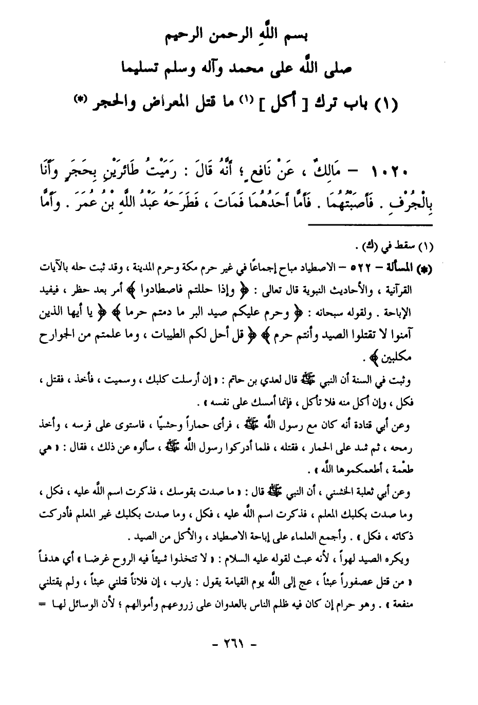 1020 - مَالِكٌ، عَنْ نَافِعٍ أَنَّهُ قَالَ: رَمَيْتُ طَائِرَيْنِ بِحَجَرٍ وَأَنَا بِالْجُرْفِ. فَأَصَبْتُهُمَا. فَأَمَّا أَحَدُهُمَا فَمَاتَ، فَطَرَحَهُ عَبَدُ اللَّهِ بْنُ عُمَرَ. وَأَمَّا