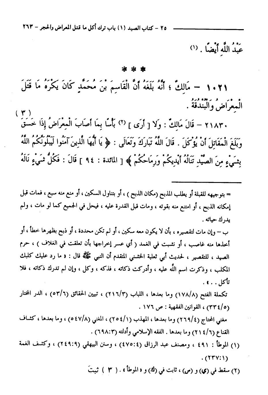 1021 - مَالِكٌ ; أَنَّهُ بَلَغَهُ أَنَّ الْقَاسِمَ بْنَ مُحَمَّدٍ كَانَ يَكْرَهُ مَا قَتَلَ الْمِعْرَاضُ وَالْبُنْدُقَةُ.
