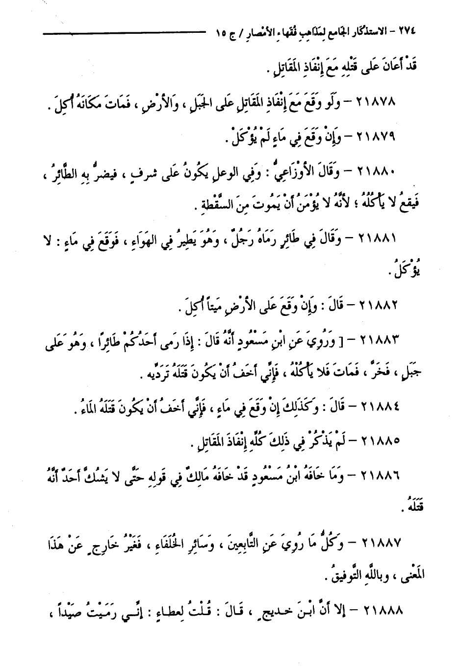 21883 - وُرُوِيَ عَنِ ابْنِ مَسْعُودٍ أَنَّهُ قَالَ: إِذَا رَمَى أَحَدُكُمْ طَائِرًا، وَهُوَ عَلَى جَبَلٍ، فَخَرَّ، فَمَاتَ فَلَا يَأْكُلْهُ، فَإِنِّي أَخَافُ أَنْ يَكُونَ قَتَلَهُ تَرَدِّيهِ.