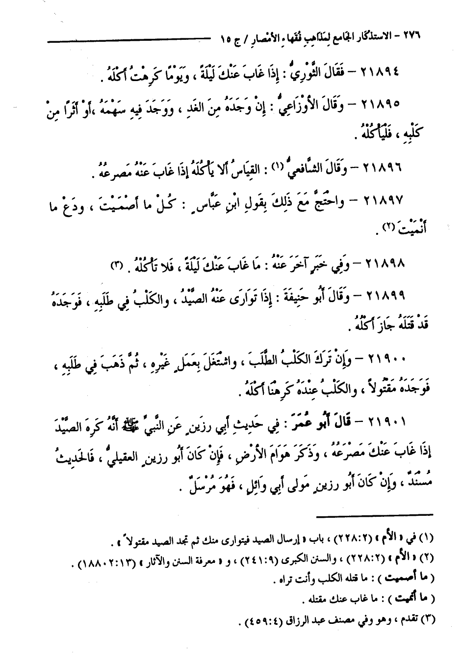 21895 - وَقَالَ الْأَوْزَاعِيُّ: إِنْ وَجَدَهُ مِنَ الْغَدِ، وَوَجَدَ فِيهِ سَهْمَهُ، أَوْ أَثَرًا مِنْ كَلْبِهِ، فَلْيَأْكُلْ.