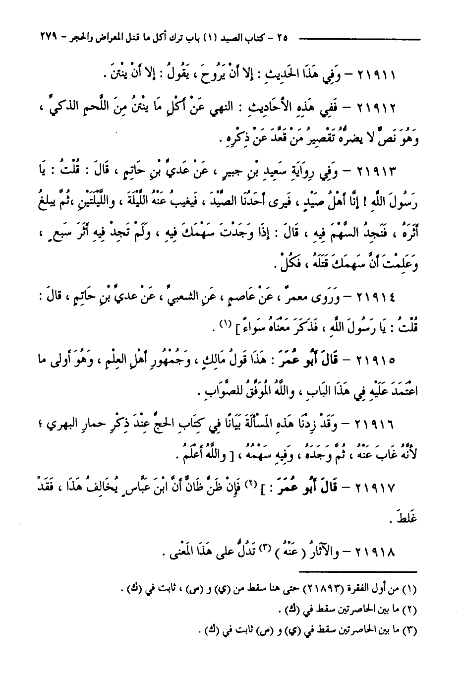 21913 - وَفِي رِوَايَةِ سَعِيدِ بْنِ جُبَيْرٍ، عَنْ عَدِيِّ بْنِ حَاتِمٍ، قَالَ: قُلْتُ: يَا رَسُولَ اللَّهِ إِنَّا أَهْلُ صَيْدٍ، فَيَرَى أَحَدُنَا الصَّيْدَ، فَيَغِيبُ عَنْهُ اللَّيْلَةَ، وَاللَّيْلَتَيْنِ، ثُمَّ يَبْلُغُ أَثَرَهُ، فَنَجِدُ السَّهْمَ فِيهِ، قَالَ: إِذَا وَجَدْتَ سَهْمَكَ فِيهِ، وَلَمْ تَجِدْ فِيهِ أَثَرَ سَبُعٍ، وَعَلِمْتَ أَنَّ سَهْمَكَ قَتَلَهُ، فَكُلْ.