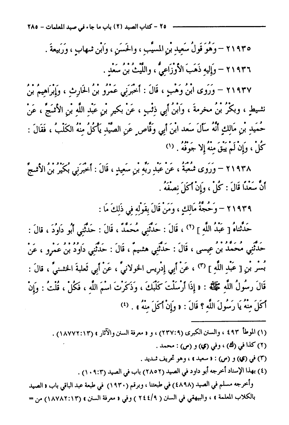21937 - وَرَوَى ابْنُ وَهْبٍ، قَالَ: أَخْبَرَنِي عَمْرُو بْنُ الْحَارِثِ، وَإِبْرَاهِيمُ بْنُ نَشِيطٍ، وَبَكْرُ بْنُ مَخْرَمَةَ، وَابْنُ أَبِي ذِئْبٍ، عَنْ بُكَيْرِ بْنِ عَبْدِ اللَّهِ بْنِ الْأَشَجِّ، عَنْ حُمَيْدِ بْنِ مَالِكٍ أَنَّهُ سَأَلَ سَعْدَ بْنَ أَبِي وَقَاصٍ عَنِ الصَّيْدِ يَأْكُلُ مِنْهُ الْكَلْبُ، فَقَالَ: كُلْ، وَإِنْ لَمْ يَبْقَ مِنْهُ إِلَّا جَوْفُهُ.