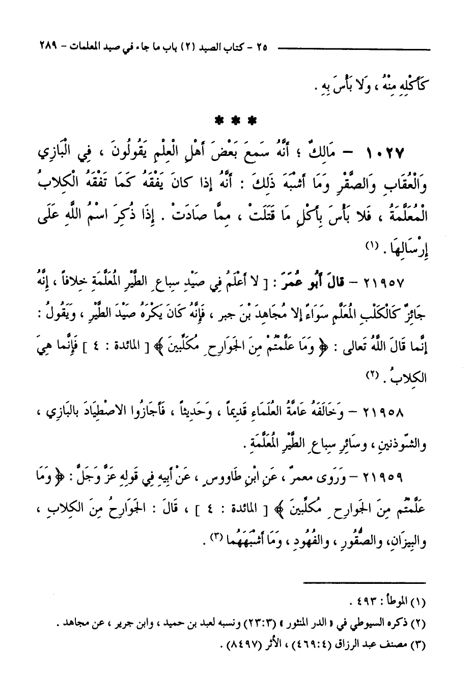 1027 - مَالِكٌ أَنَّهُ سَمِعَ بَعْضَ أَهْلِ الْعِلْمِ يَقُولُونَ، فِي الْبَازِيِ وَالْعُقَابِ وَالصَّقْرِ وَمَا أَشْبَهَ ذَلِكَ: أَنَّهُ إِذَا كَانَ يَفْقَهُ كَمَا تَفْقَهُ الْكِلَابُ الْمُعَلَّمَةُ، فَلَا بَأْسَ بِأَكْلِ مَا قَتَلَتْ، مِمَّا صَادَتْ. إِذَا ذُكِرَ اسْمُ اللَّهِ عَلَى إِرْسَالِهَا.