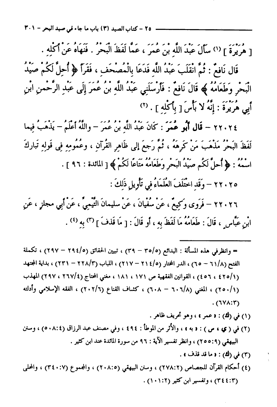 22024 - قَالَ أَبُو عُمَرَ: كَانَ عَبْدُ اللَّهِ بْنُ عُمَرَ - وَاللَّهُ أَعْلَمُ - يَذْهَبُ فِيمَا لَفَظَ الْبَحْرُ مَذْهَبَ مَنْ كَرِهَهُ، ثُمَّ رَجَعَ إِلَى ظَاهِرِ الْقُرْآنِ، وَعُمُومِهِ فِي قَوْلِهِ تَبَارَكَ اسْمُهُ:أُحِلَّ لَكُمْ صَيْدُ الْبَحْرِ وَطَعَامُهُ مَتَاعًا لَكُمْ [ الْمَائِدَةِ: 96 ].