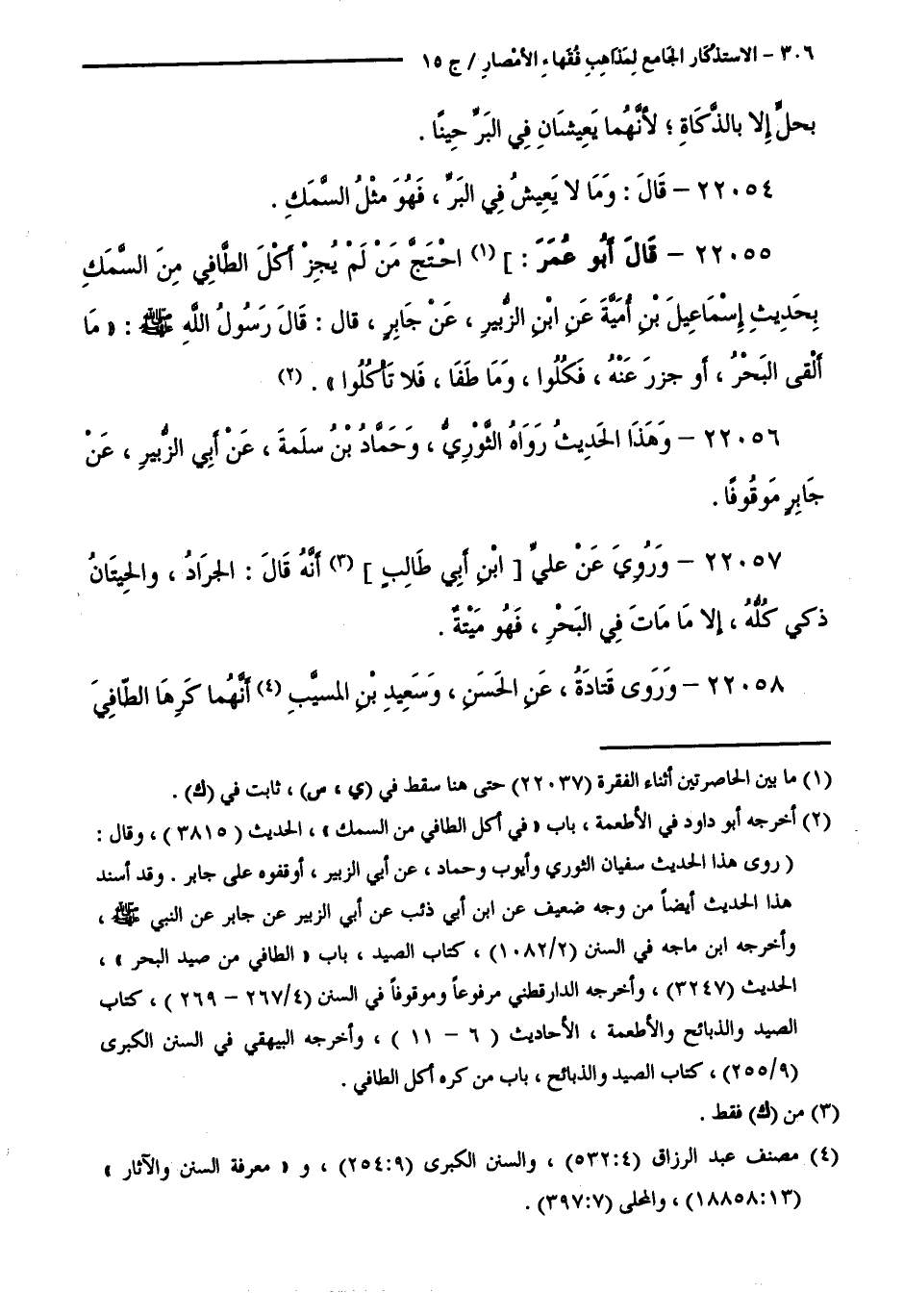 22055 - قَالَ أَبُو عُمَرَ: احْتَجَّ مَنْ لَمْ يُجِزْ أَكْلَ الطَّافِي مِنَ السَّمَكِ بِحَدِيثِ إِسْمَاعِيلَ بْنِ أُمَيَّةَ عَنِ ابْنِ الزُّبَيْرِ، عَنْ جَابِرٍ، قَالَ: قَالَ رَسُولُ اللَّهِ - صَلَّى اللَّهُ عَلَيْهِ وَسَلَّمَ: مَا أَلْقَى الْبَحْرُ، أَوْ جَزَرَ عَنْهُ، فَكُلُوا، وَمَا طَفَا، فَلَا تَأْكُلُوا.