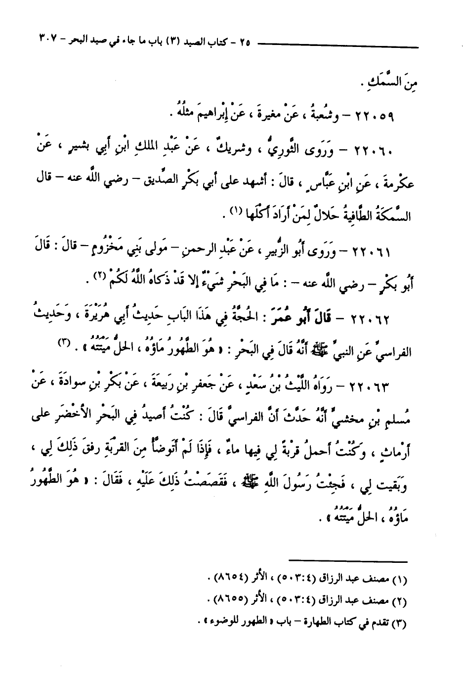 22063 - رَوَاهُ اللَّيْثُ بْنُ سَعْدٍ، عَنْ جَعْفَرِ بْنِ رَبِيعَةَ، عَنْ بَكْرِ بْنِ سِوَادَةَ، عَنْ مُسْلِمِ بْنِ مَخْشِيٍّ أَنَّهُ حَدَّثَ أَنَّ الْفِرَاسِيَّ قَالَ: كُنْتُ أَصِيدُ فِي الْبَحْرِ الْأَخْضَرِ عَلَى أَرْمَاثٍ، وَكُنْتُ أَحْمِلُ قِرْبَةً لِي فِيهَا مَاءٌ، فَإِذَا لَمْ أَتَوَضَّأْ مِنَ الْقِرْبَةِ رَفُقَ ذَلِكَ بِي، وَبَقِيَتْ لِي، فَجِئْتُ رَسُولَ اللَّهِ - صَلَّى اللَّهُ عَلَيْهِ وَسَلَّمَ - فَقَصَصْتُ ذَلِكَ عَلَيْهِ، فَقَالَ: هُوَ الطَّهُورُ مَاؤُهُ، الْحِلُّ مِيتَتُهُ.