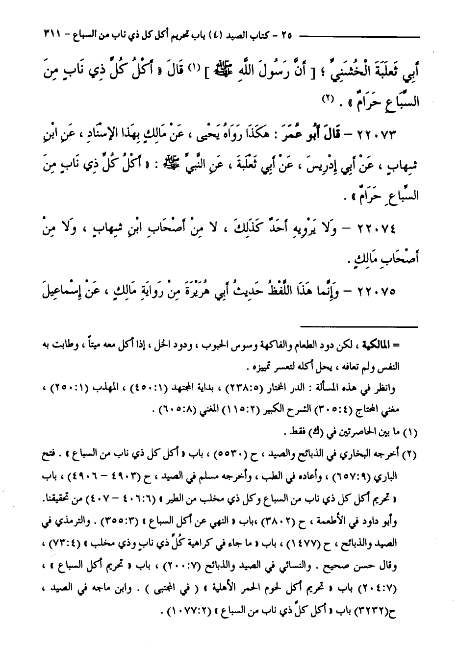 22073 - قَالَ أَبُو عُمَرَ: هَكَذَا رَوَاهُ يَحْيَى، عَنْ مَالِكٍ بِهَذَا الْإِسْنَادِ، عَنِ ابْنِ شِهَابٍ. عَنْ أَبِي إِدْرِيسَ، عَنْ أَبِي ثَعْلَبَةَ، عَنِ النَّبِيِّ - صَلَّى اللَّهُ عَلَيْهِ وَسَلَّمَ -: أَكْلُ كُلُّ ذِي نَابٍ مِنَ السِّبَاعَ حَرَامٌ.