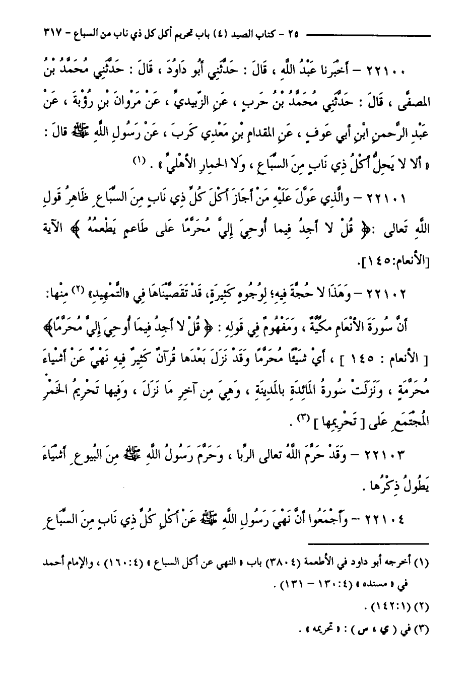 22100 - أَخْبَرَنَا عَبْدُ اللَّهِ، قَالَ: حَدَّثَنِي أَبُو دَاوُدَ، قَالَ: حَدَّثَنِي مُحَمَّدُ بْنُ الْمُصَفَّى، قَالَ: حَدَّثَنِي مُحَمَّدُ بْنُ حَرْبٍ، عَنِ الزُّبَيْدِيِّ، عَنْ مَرْوَانَ بْنِ رُؤْبَةَ، عَنْ عَبْدِ الرَّحْمَنِ بْنِ عَوْفٍ، عَنِ الْمِقْدَامِ بْنِ مَعْدِي كَرِبَ، عَنْ رَسُولِ اللَّهِ صَلَّى اللَّهُ عَلَيْهِ وَسَلَّمَ قَالَ: " أَلَا لَا يَحِلُّ أَكْلُ ذِي نَابٍ مِنَ السِّبَاعِ، وَلَا الْحِمَارِ الْأَهْلِيِّ.