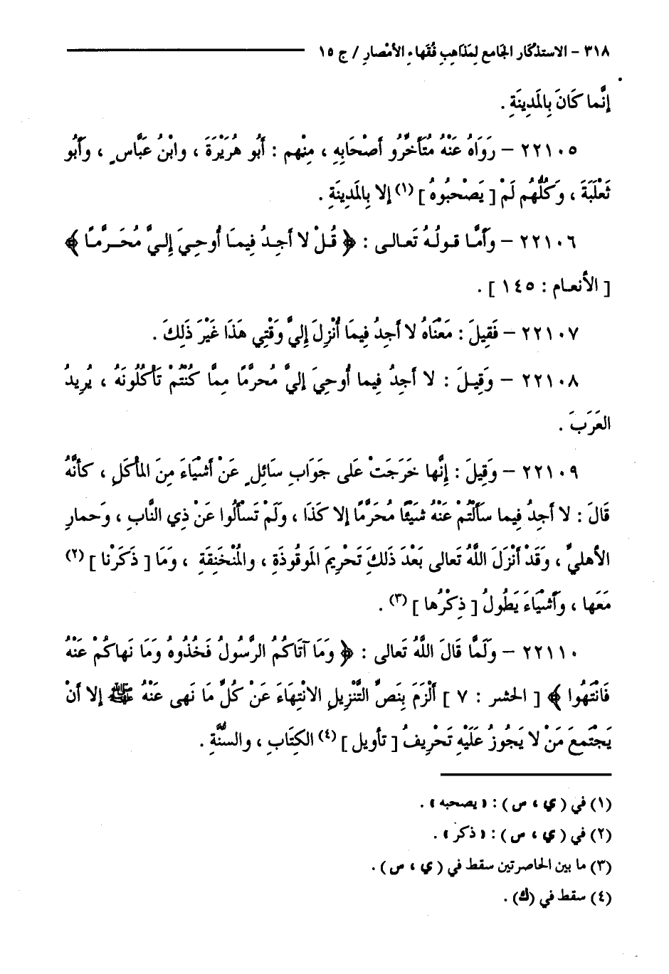 22110 - وَلَمَّا قَالَ اللَّهُ تَعَالَى:وَمَا آتَاكُمُ الرَّسُولُ فَخُذُوهُ وَمَا نَهَاكُمْ عَنْهُ فَانْتَهُوا [ الْحَشْرِ: 7 ]، أَلْزَمَ بِنَصِّ التَّنْزِيلِ الِانْتِهَاءَ عَنْ كُلِّ مَا نَهَى عَنْهُ - صَلَّى اللَّهُ عَلَيْهِ وَسَلَّمَ - إِلَّا أَنْ يَجْتَمِعَ مَنْ لَا يَجُوزُ عَلَيْهِ تَحْرِيفُ تَأْوِيلِ الْكِتَابِ وَالسُّنَّةِ