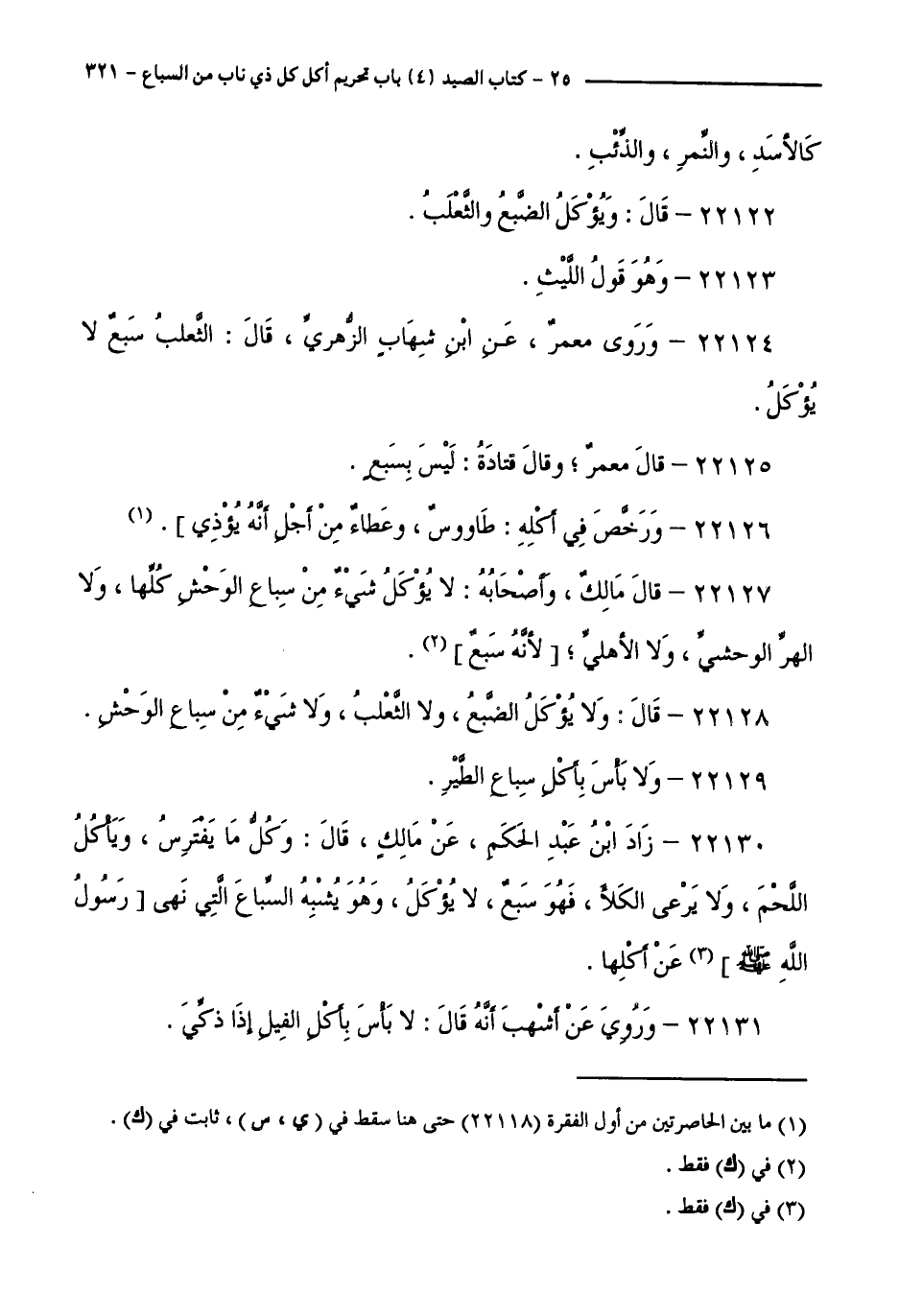 22130 - زَادَ ابْنُ عَبْدِ الْحَكَمِ، عَنْ مَالِكٍ، قَالَ: وَكُلُّ مَا يَفْتَرِسُ، وَيَأَكُلُ اللَّحْمَ، وَلَا يَرْعَى الْكَلَأَ، فَهُوَ سَبُعٌ، لَا يُؤْكَلُ وَهُوَ يُشْبِهُ السِّبَاعَ الَّتِي نَهَى رَسُولُ اللَّهِ - صَلَّى اللَّهُ عَلَيْهِ وَسَلَّمَ - عَنْ أَكْلِهَا.