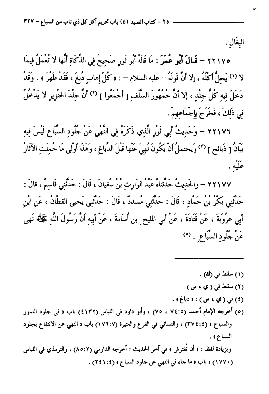 22177 - والحديث حدثناه عبد الوارث بن سفيان قال: حدثني قاسم، قال: حدثني بكر بن حماد، قال: حدثني مسدد، قال: حدثني يحيى القطان عن بن أبي عروبة عن قتادة عن أبي المليح بن أسامة عن أبيه أن رسول الله صَلَّى اللَّهُ عَلَيْهِ وَسَلَّمَ نَهَى عَنْ جُلُودِ السِّبَاعِ.