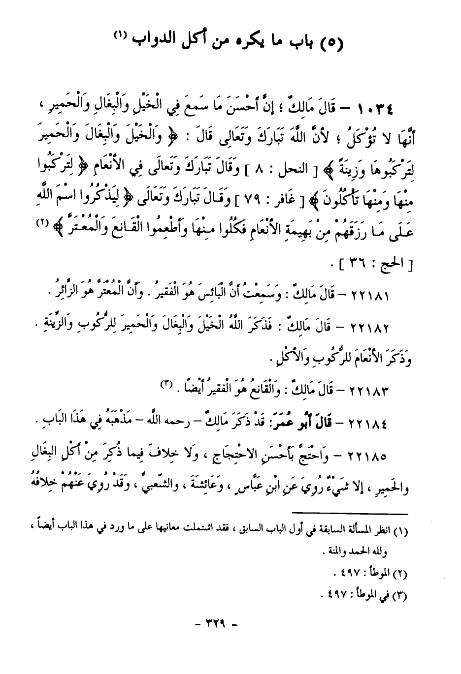 1034 - قَالَ مَالِكٌ: إِنَّ أَحْسَنَ مَا سَمِعَ فِي الْخَيْلِ وَالْبِغَالِ وَالْحَمِيرِ، أَنْهَا لَا تُؤْكَلُ، لِأَنَّ اللَّهَ تَبَارَكَ وَتَعَالَى قَالَ:وَالْخَيْلَ وَالْبِغَالَ وَالْحَمِيرَ لِتَرْكَبُوهَا وَزِينَةً [ النَّحْلِ: 8 ]، وَقَالَ تَبَارَكَ وَتَعَالَى فِي الْأَنْعَامِلِتَرْكَبُوا مِنْهَا وَمِنْهَا تَأْكُلُونَ [ غَافِرٍ: 79 ]، وَقَالَ تَبَارَكَ وَتَعَالَىلِيَذْكُرُوا اسْمَ اللَّهِ عَلَى مَا رَزَقَهُمْ مِنْ بَهِيمَةِ الْأَنْعَامِ فَكُلُوا مِنْهَا وَأَطْعِمُوا الْقَانِعَ وَالْمُعْتَرَّ [ الْحَجِّ: 36 ].