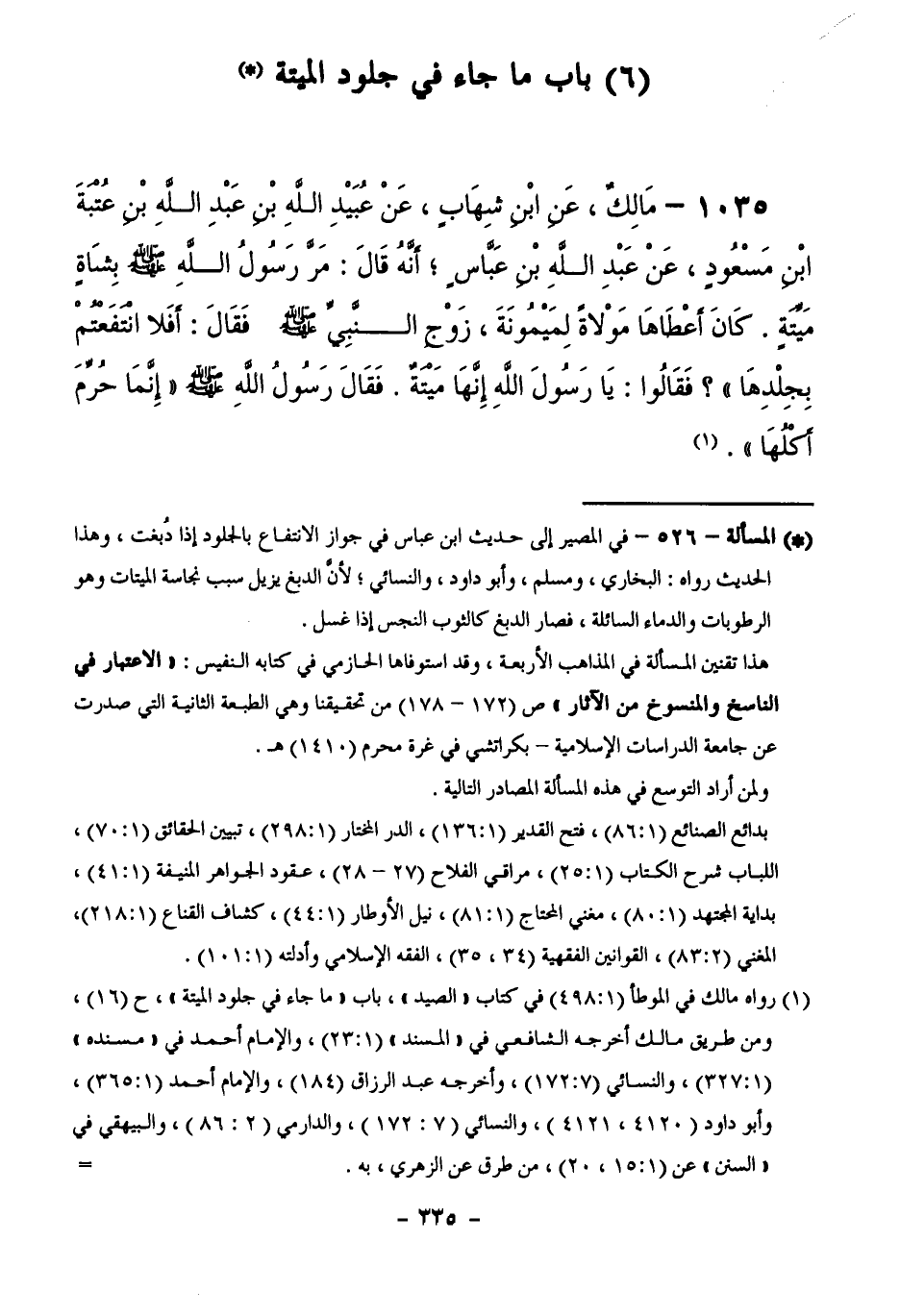 1035 - مَالِكٌ، عَنِ ابْنِ شِهَابٍ، عَنْ عُبَيْدِ اللَّهِ بْنِ عَبْدِ اللَّهِ بْنِ عُتْبَةَ بْنِ مَسْعُودٍ، عَنْ عَبْدِ اللَّهِ بْنِ عَبَّاسٍ أَنَّهُ قَالَ: مَرَّ رَسُولُ اللَّهِ - صَلَّى اللَّهُ عَلَيْهِ وَسَلَّمَ - بِشَاةٍ مَيِّتَةٍ. كَانَ أَعْطَاهَا مَوْلَاهُ لِمَيْمُونَةَ، زَوْجِ النَّبِيِّ - صَلَّى اللَّهُ عَلَيْهِ وَسَلَّمَ - فَقَالَ: أَفَلَا انْتَفَعْتُمْ بِجِلْدِهَا ؟ فَقَالُوا: يَا رَسُولَ اللَّهِ إِنَّهَا مَيْتَةٌ. فَقَالَ رَسُولُ اللَّهِ - صَلَّى اللَّهُ عَلَيْهِ وَسَلَّمَ - إِنَّمَا حُرِّمَ أَكْلُهَا.
