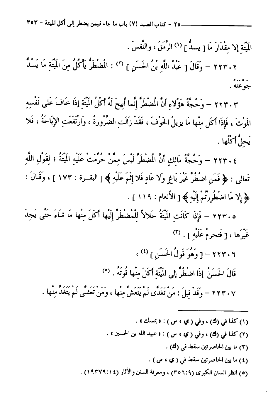 22302 - وَقَالَ عَبْدُ اللَّهِ بْنُ الْحَسَنِ: الْمُضْطَرُّ يَأْكُلُ مِنَ الْمَيْتَةِ مَا يَسُدُّ جَوْعَتَهُ.