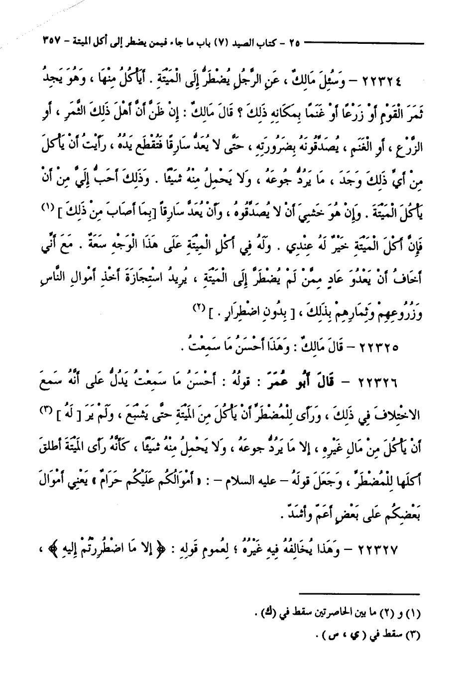 22326 - قَالَ أَبُو عُمَرَ: قَوْلُهُ: أَحْسَنُ مَا سَمِعْتُ يَدُلُّ عَلَى أَنَّهُ سَمِعَ الِاخْتِلَافَ فِي ذَلِكَ، وَرَأَى لِلْمُضْطَرِّ أَنْ يَأْكُلَ مِنَ الْمَيْتَةِ حَتَّى يَشْبَعَ، وَلَمْ يَرَ لَهُ أَنْ يَأْكُلَ مِنْ مَالِ غَيْرِهِ، إِلَّا مَا يَرُدُّ جُوعَهُ، وَلَا يَحْمِلُ مِنْهُ شَيْئًا، كَأَنَّهُ رَأَى الْمَيْتَةَ أُطْلِقَ أَكْلُهَا لِلْمُضْطَرِّ، وَجَعَلَ قَوْلَهُ - عَلَيْهِ السَّلَامُ -: " أَمْوَالُكُمْ عَلَيْكُمْ حَرَامٌ " يَعْنِي أَمْوَالُ بَعْضِكُمْ عَلَى بَعْضٍ أَعَمُّ وَأَشَدُّ.