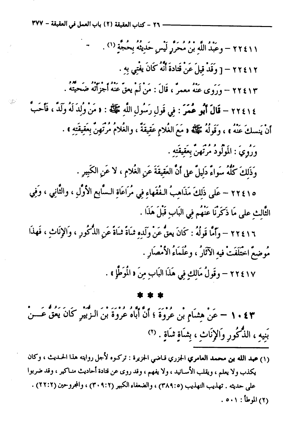 1043 - عَنْ هِشَامِ بْنِ عُرْوَةَ ; أَنَّ أَبَاهُ عُرْوَةَ بْنَ الزُّبَيْرِ كَانَ يَعُقُّ عَنْ بَنِيهِ، الذُّكُورِ وَالْإِنَاثِ، بِشَاةٍ شَاةٍ.