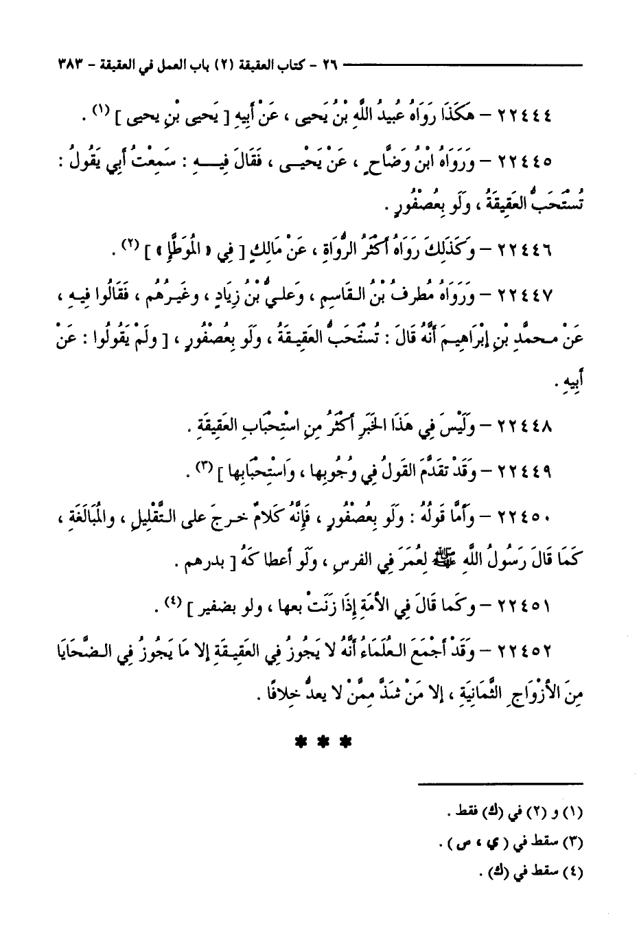 22445 - وَرَوَاهُ ابْنُ وَضَّاحٍ، عَنْ يَحْيَى، فَقَالَ فِيهِ: سَمِعَتْ أَبِي يَقُولُ: تُسْتَحَبُّ الْعَقِيقَةُ، وَلَوْ بِعُصْفُورٍ.