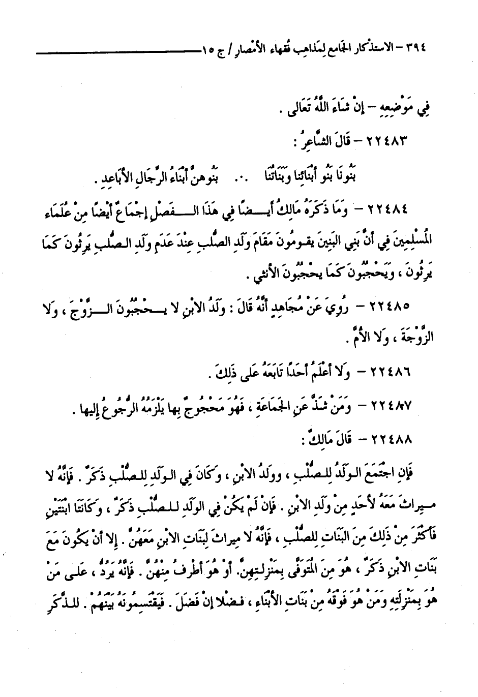 22484 - وَمَا ذَكَرَهُ مَالِكٌ أَيْضًا فِي هَذَا الْفَصْلِ إِجْمَاعٌ أَيْضًا مِنْ عُلَمَاءِ الْمُسْلِمِينَ فِي أَنَّ بَنِي الْبَنِينَ يَقُومُونَ مَقَامَ وَلَدِ الصُّلْبِ عِنْدَ عَدَمِ وَلَدِ الصُّلْبِ يَرِثُونَ كَمَا يَرِثُونَ، وَيَحْجُبُونَ كَمَا يَحْجُبُونَ الْأُنْثَى.