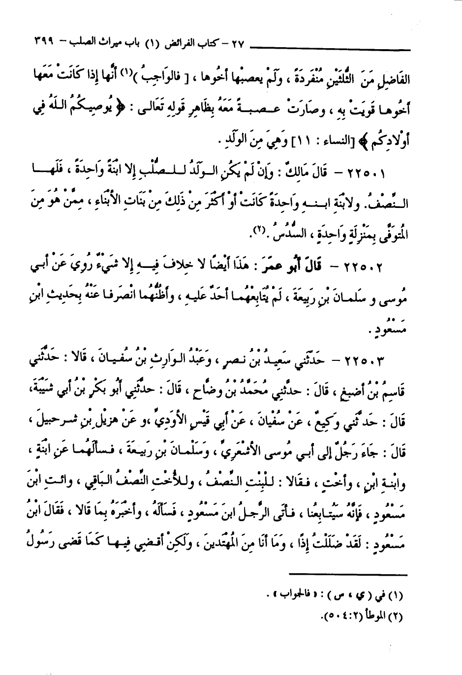 22503 - حَدَّثَنِي سَعِيدُ بْنُ نَصْرٍ، وَعَبْدُ الْوَارِثِ بْنُ سُفْيَانَ، قَالَا: حَدَّثَنِي قَاسِمُ بْنُ أَصْبَغَ، قَالَ: حَدَّثَنِي مُحَمَّدُ بْنُ وَضَّاحٍ، قَالَ: حَدَّثَنِي أَبُو بَكْرِ بْنُ أَبِي شَيْبَةَ، قَالَ: حَدَّثَنِي وَكِيعٌ، عَنْ سُفْيَانَ، عَنْ أَبِي قَيْسٍ الْأَوْدِيِّ، وَعَنْ هُزَيْلِ بْنِ شُرَحْبِيلَ، قَالَ: جَاءَ رَجُلٌ إِلَى أَبِي مُوسَى الْأَشْعَرِيِّ، وَسَلْمَانَ بْنِ رَبِيعَةَ، فَسَأَلَهُمَا عَنِ ابْنَةٍ، وَابْنَةِ ابْنٍ، وَأُخْتٍ، فَقَالَا: لِلْبِنْتِ النِّصْفُ، وَلِلْأُخْتِ النِّصْفُ الْبَاقِي، وَائْتِ ابْنَ مَسْعُودٍ فَإِنَّهُ سَيُتَابِعُنَا، فَأَتَى الرَّجُلَ ابْنَ مَسْعُودٍ، فَسَأَلَهُ، وَأَخْبَرَهُ بِمَا قَالَا، فَقَالَ ابْنُ مَسْعُودٍ: لَقَدْ ضَلَلْتُ إِذًا، وَمَا أَنَا مِنَ الْمُهْتَدِينَ، وَلَكِنْ أَقْضِي فِيهَا كَمَا قَضَى رَسُولُ