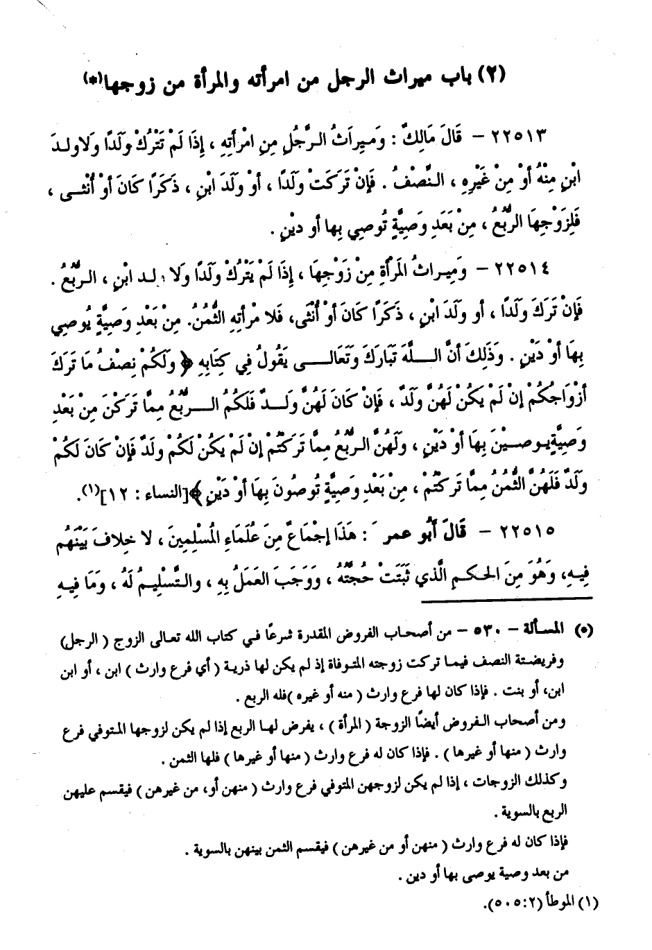 22513 - قَالَ مَالِكٌ: مِيرَاثُ الرَّجُلِ مِنَ امْرَأَتِهِ، إِذَا لَمْ تَتْرُكْ وَلَدًا وَلَا وَلَدَ ابْنٍ مِنْهُ أَوْ مِنْ غَيْرِهِ، النِّصْفُ. فَإِنْ تَرَكَتْ وَلَدًا، أَوْ وَلَدَ ابْنٍ، ذَكَرًا كَانَ أَوْ أُنْثَى، فَلِزَوْجِهَا الرُّبُعُ، مِنْ بَعْدِ وَصِيَّةٍ تُوصِي بِهَا أَوْ دَيْنٍ.