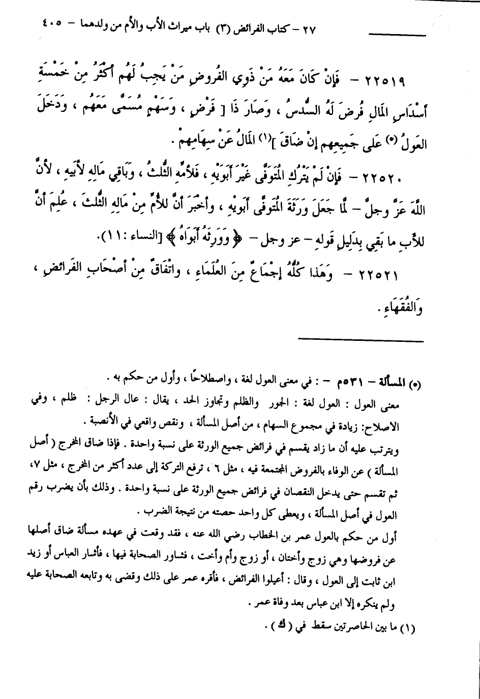 22519 - فَإِنْ كَانَ مَعَهُ مِنْ ذَوِي الْفُرُوضِ مَنْ يَجِبُ لَهُمْ أَكْثَرُ مِنْ خَمْسَةِ أَسْدَاسِ الْمَالِ فُرِضَ لَهُ السُّدُسُ، وَصَارَ ذَا فَرْضٍ وَسَهْمٍ مُسَمًّى مَعَهُمْ، وَدَخَلَ الْعَوْلُ عَلَى جَمِيعِهِمْ إِنْ ضَاقَ الْمَالُ عَنْ سِهَامِهِمْ.