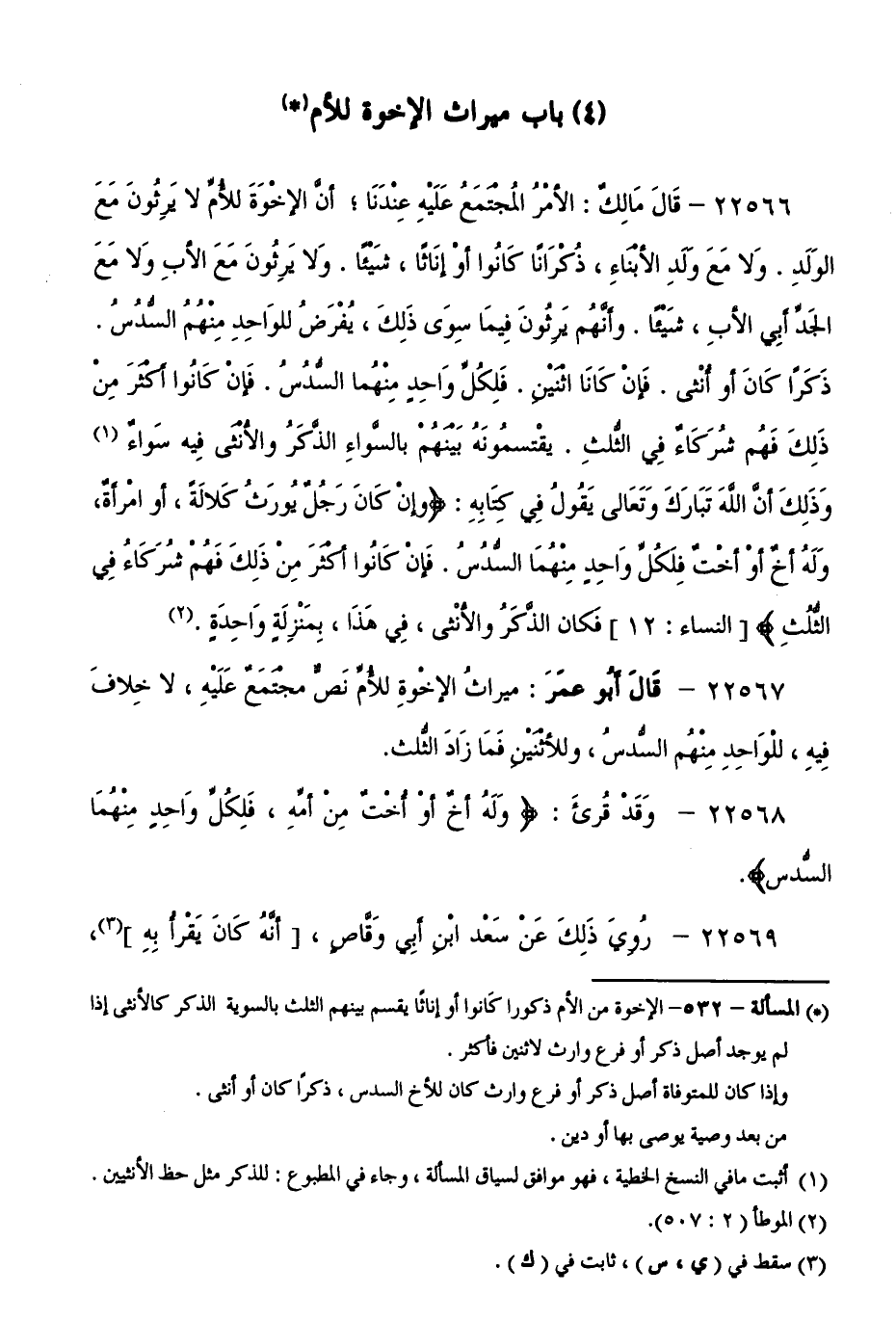 22566 - قَالَ مَالِكٌ: الْأَمْرُ الْمُجْتَمَعُ عَلَيْهِ عِنْدَنَا ; أَنَّ الْإِخْوَةَ لِلْأُمِّ لَا يَرِثُونَ مَعَ الْوَلَدِ، وَلَا مَعَ وَلَدِ الْأَبْنَاءِ، ذُكْرَانًا كَانُوا أَوْ إِنَاثًا، شَيْئًا، وَلَا يَرِثُونَ مَعَ الْأَبِ وَلَا مَعَ الْجَدِّ أَبِي الْأَبِ، شَيْئًا. وَأَنَّهُمْ يَرْثُونَ فِيمَا سِوَى ذَلِكَ، يُفْرَضُ لِلْوَاحِدِ مِنْهُمُ السُّدُسُ. ذَكَرًا كَانَ أَوْ أُنْثَى. فَإِنْ كَانَا اثْنَيْنِ. فَلِكُلِّ وَاحِدٍ مِنْهُمَا السُّدُسُ. فَإِنْ كَانُوا أَكْثَرَ مِنْ ذَلِكَ فَهُمْ شُرَكَاءُ فِي الثُّلُثِ. يَقْتَسِمُونَهُ بَيْنَهُمْ بِالسَّوَاءِ الذَّكَرُ وَالْأُنْثَى فِيهِ سَوَاءٌ وَذَلِكَ أَنَّ اللَّهَ تَبَارَكَ وَتَعَالَى يَقُولُ فِي كِتَابِهِ: 4وَإِنْ كَانَ رَجُلٌ يُورَثُ كَلَالَةً أَوِ امْرَأَةٌ وَلَهُ أَخٌ أَوْ أُخْتٌ فَلِكُلِّ وَاحِدٍ مِنْهُمَا السُّدُسُ فَإِنْ كَانُوا أَكْثَرَ مِنْ ذَلِكَ فَهُمْ شُرَكَاءُ فِي الثُّلُثِ [ النِّسَاءِ: 12 ] فَكَانَ الذَّكَرُ وَالْأُنْثَى، فِي هَذَا، بِمَنْزِلَةٍ وَاحِدَةٍ.