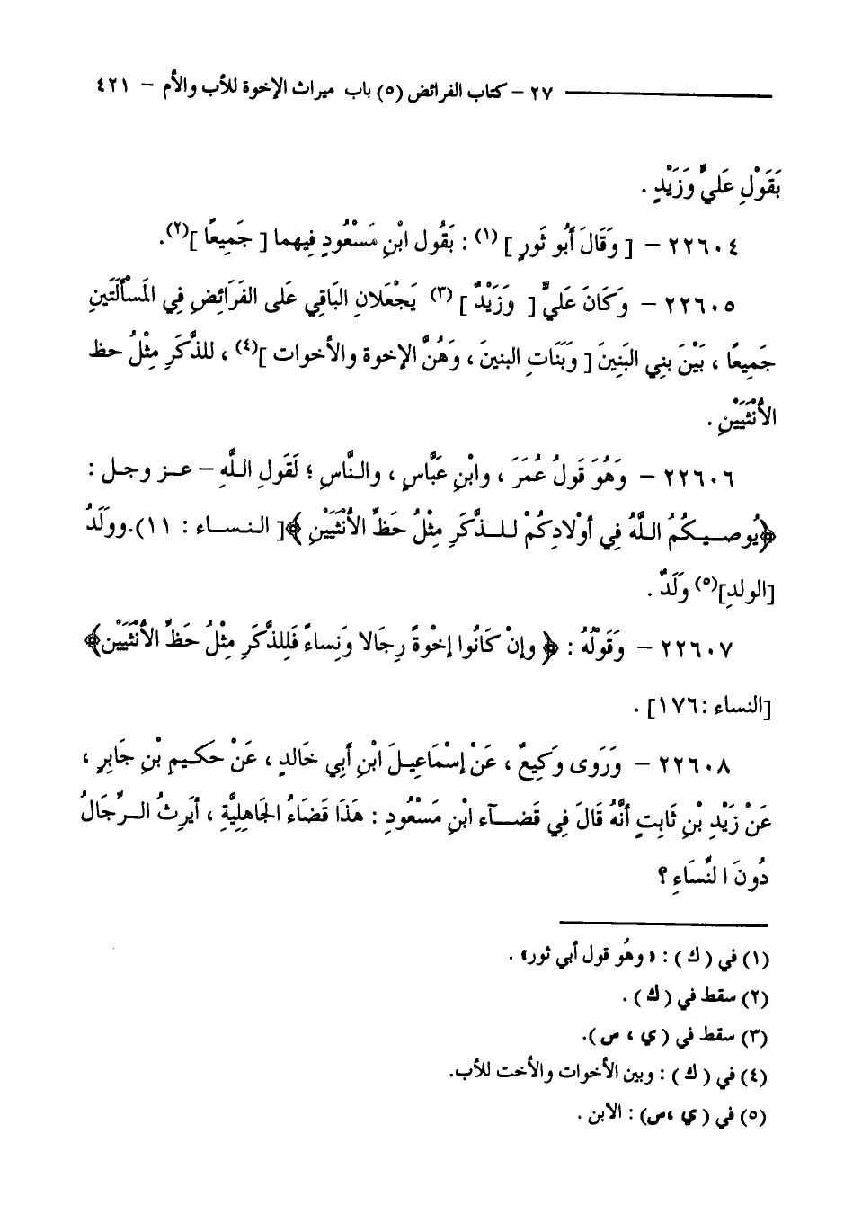 22605 - وَكَانَ عَلِيٌّ وَزَيْدٌ يَجْعَلَانِ الْبَاقِيَ عَلَى الْفَرَائِضِ فِي الْمَسْأَلَتَيْنِ جَمِيعًا، بَيْنَ بَنِي الْبَنِينَ وَبَنَاتِ الْبَنِينَ، وَهُنَّ الْإِخْوَةُ وَالْأَخَوَاتُ، لِلذَّكَرِ مِثْلُ حَظِّ الْأُنْثَيَيْنِ.