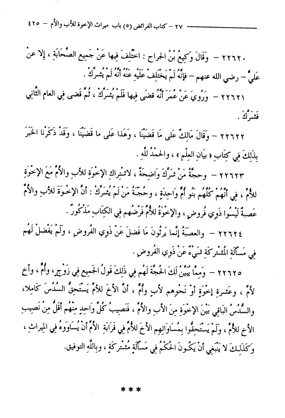 22620 - وَقَالَ وَكِيعُ بْنُ الْجَرَّاحِ: اخْتُلِفَ فِيهَا عَنْ جَمِيعِ الصَّحَابَةِ، إِلَّا عَنْ عَلِيٍّ - رَضِيَ اللَّهُ عَنْهُمْ - فَإِنَّهُ لَمْ يُخْتَلَفْ عَلَيْهِ عَنْ أَنَّهُ لَمْ يُشَرِّكْ.