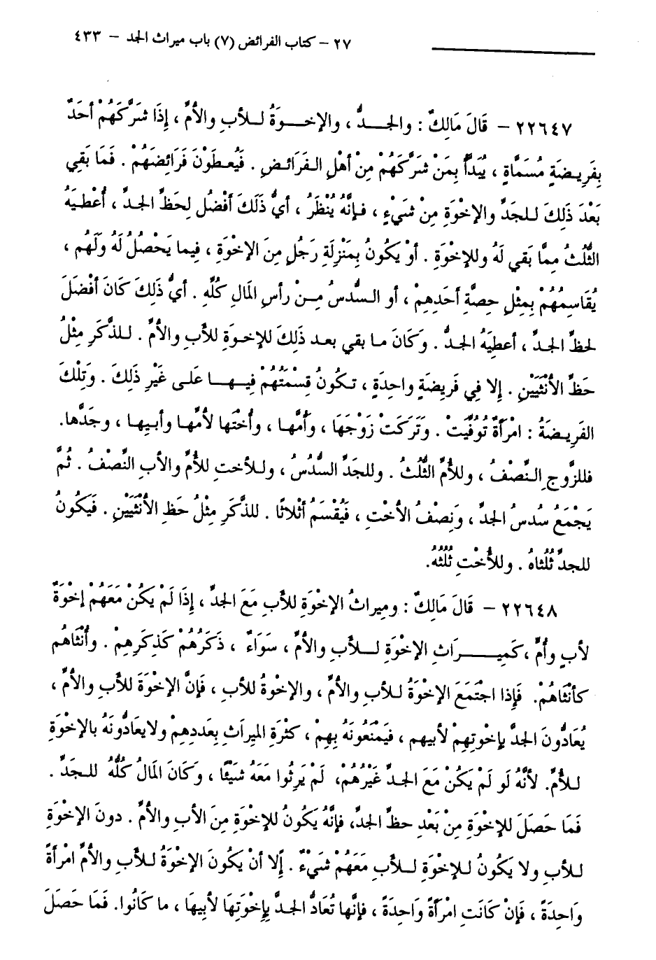 22648 - قَالَ مَالِكٌ: وَمِيرَاثُ الْإِخْوَةِ لِلْأَبِ مَعَ الْجَدِّ، إِذَا لَمْ يَكُنْ مَعَهُمْ إِخْوَةٌ لِأَبٍ وَأُمٍّ، كَمِيرَاثِ الْإِخْوَةِ لِلْأَبِ وَالْأُمِّ، سَوَاءٌ، ذَكَرُهُمْ كَذَكَرِهِمْ، وَأُنْثَاهُمْ كَأُنْثَاهُمْ. فَإِذَا اجْتَمَعَ الْإِخْوَةُ لِلْأَبِ وَالْأُمِّ، وَالْإِخْوَةُ لِلْأَبِ، فَإِنَّ الْإِخْوَةَ لِلْأَبِ وَالْأُمِّ، يُعَادُّونَ الْجَدَّ بِإِخْوَتِهِمْ لِأَبِيهِمْ، فَيَمْنَعُونَهُ بِهِمْ كَثْرَةِ الْمِيرَاثِ بِعَدَدِهِمْ وَلَا يُعَادُّونَهُ بِالْإِخْوَةِ لِلْأُمِّ، لِأَنَّهُ لَوْ لَمْ يَكُنْ مَعَ الْجَدِّ غَيْرُهُمْ. لَمْ يَرْثُوا مَعَهُ شَيْئًا، وَكَانَ الْمَالُ كُلُّهُ لِلْجَدِّ. فَمَا حَصَلَ لِلْإِخْوَةِ مِنْ بَعْدِ حَظِّ الْجَدِّ، فَإِنَّهُ يَكُونُ لِلْإِخْوَةِ مِنَ الْأَبِ وَالْأُمِّ. دُونَ الْإِخْوَةِ لِلْأَبِ وَلَا يَكُونُ لِلْإِخْوَةِ لِلْأَبِ مَعَهُمْ شَيْءٌ، إِلَّا أَنْ يَكُونَ الْإِخْوَةُ لِلْأَبِ وَالْأُمِّ امْرَأَةً وَاحِدَةً، فَإِنْ كَانَتِ امْرَأَةً وَاحِدَةً، فَإِنَّهَا تُعَادُّ الْجَدَّ بِإِخْوَتِهَا لِأَبِيهَا مَا كَانُوا فَمَا حَصَلَ
