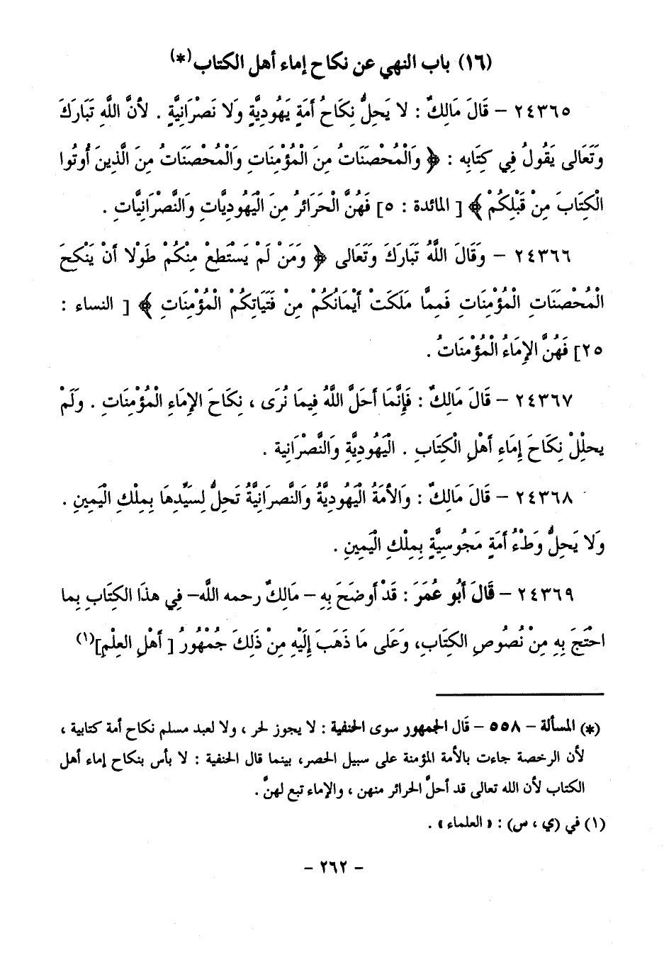 24365 - قَالَ مَالِكٌ: لَا يَحِلُّ نِكَاحُ أَمَةٍ يَهُودِيَّةٍ وَلَا نَصْرَانِيَّةٍ. لِأَنَّ اللَّهَ تَبَارَكَ وَتَعَالَى يَقُولُ فِي كِتَابِهِ:وَالْمُحْصَنَاتُ مِنَ الْمُؤْمِنَاتِ وَالْمُحْصَنَاتُ مِنَ الَّذِينَ أُوتُوا الْكِتَابَ مِنْ قَبْلِكُمْ [ الْمَائِدَةِ: 5 ] فَهُنَّ الْحَرَائِرُ مِنَ الْيَهُودِيَّاتِ وَالنَّصْرَانِيَّاتِ.