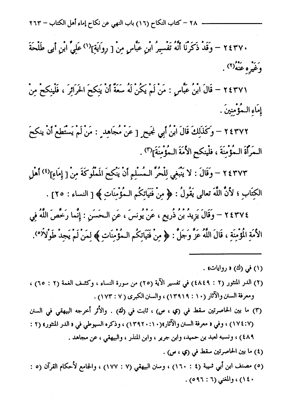 24371 - قَالَ ابْنُ عَبَّاسٍ: مَنْ لَمْ يَكُنْ لَهُ سَعَةٌ أَنْ يَنْكِحَ الْحَرَائِرَ، فَلْيَنْكِحْ مِنْ إِمَاءِ الْمُؤْمِنِينَ.