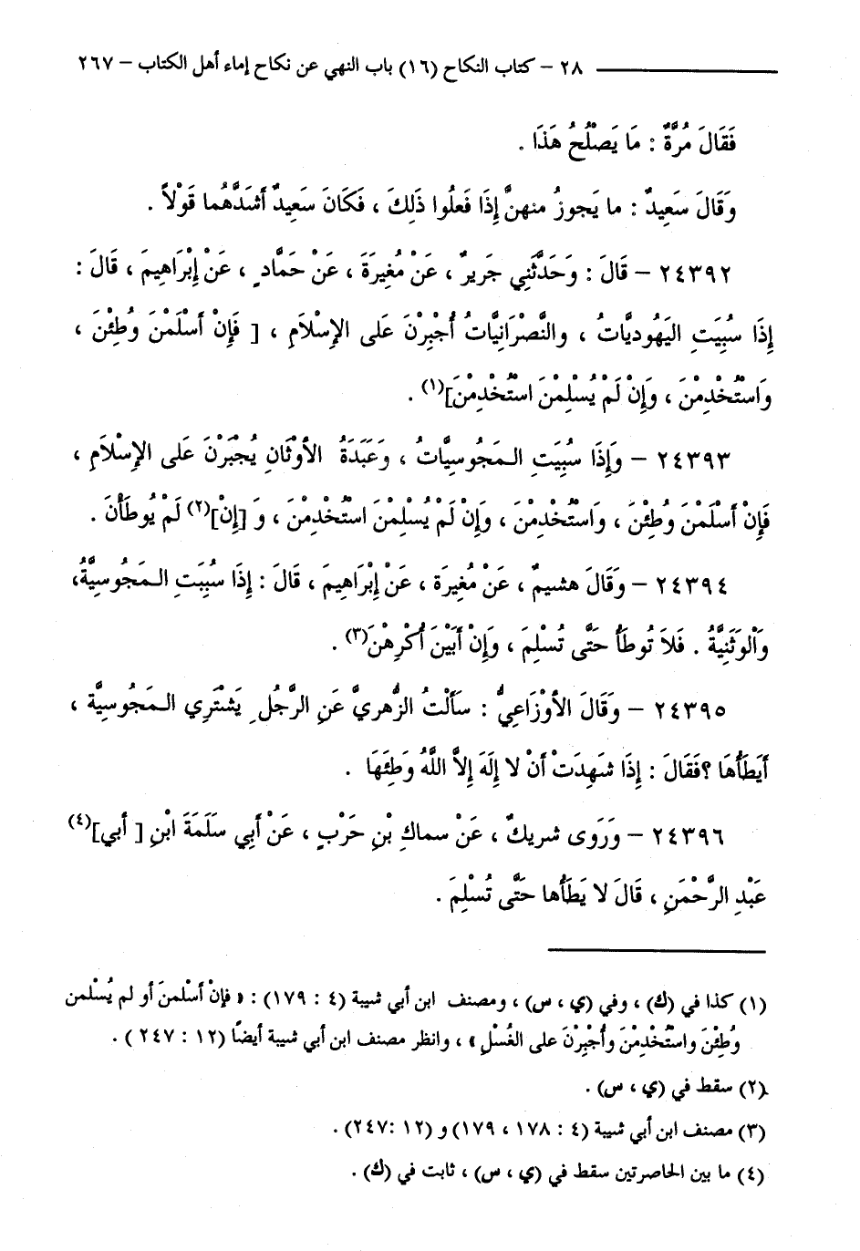 24392 - قَالَ: وَحَدَّثَنِي جَرِيرٌ، عَنْ مُغِيرَةَ، عَنْ حَمَّادٍ، عَنْ إِبْرَاهِيمَ، قَالَ: إِذَا سُبِيَتِ الْيَهُودِيَّاتُ، وَالنَّصْرَانِيَّاتُ أُجْبِرْنَ عَلَى الْإِسْلَامِ، فَإِنْ أَسْلَمْنَ وُطِئْنَ، وَاسْتُخْدِمْنَ، وَإِنْ لَمْ يُسْلِمْنَ اسْتُخْدِمْنَ.