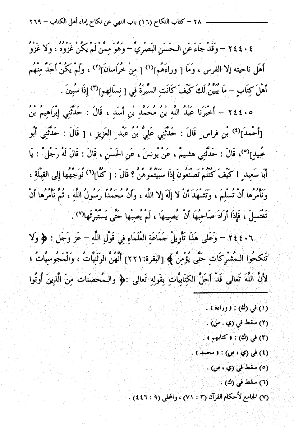 24404 - وَقَدْ جَاءَ عَنِ الْحَسَنِ الْبَصَرِيِّ - وَهُوَ مِمَّنْ لَمْ يَكُنْ غَزْوُهُ، وَلَا غَزْوُ أَهْلِ نَاحِيَتِهِ إِلَّا الْفُرْسَ، وَمَا وَرَاءَهُمْ مِنْ خُرَاسَانَ، وَلَمْ يَكُنْ أَحَدٌ مِنْهُمْ أَهْلَ كِتَابٍ - مَا يُبَيِّنُ لَكَ كَيْفَ كَانَتِ السِّيرَةُ فِي نِسَائِهِمْ إِذَا سُبِينَ.