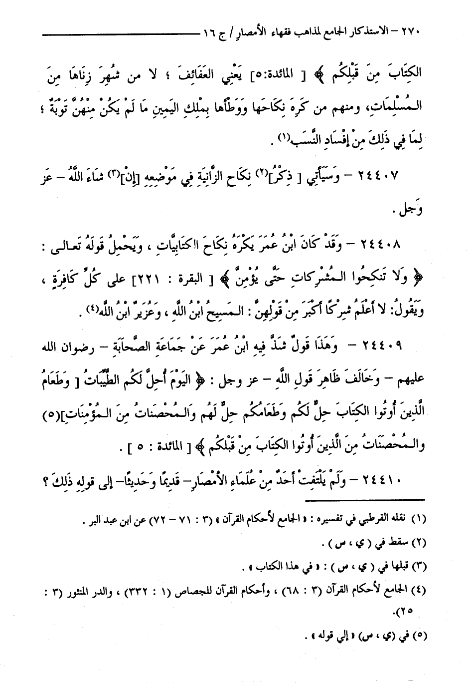 24409 - وَهَذَا قَوْلٌ شَذَّ فِيهِ ابْنُ عُمَرَ عَنْ جَمَاعَةِ الصَّحَابَةِ - رِضْوَانُ اللَّهِ عَلَيْهِمْ - وَخَالَفَ ظَاهِرَ قَوْلِ اللَّهِ، عَزَّ وَجَلَّ:الْيَوْمَ أُحِلَّ لَكُمُ الطَّيِّبَاتُ وَطَعَامُ الَّذِينَ أُوتُوا الْكِتَابَ حِلٌّ لَكُمْ وَطَعَامُكُمْ حِلٌّ لَهُمْ وَالْمُحْصَنَاتُ مِنَ الْمُؤْمِنَاتِ وَالْمُحْصَنَاتُ مِنَ الَّذِينَ أُوتُوا الْكِتَابَ مِنْ قَبْلِكُمْ [ الْمَائِدَةِ: 5 ].