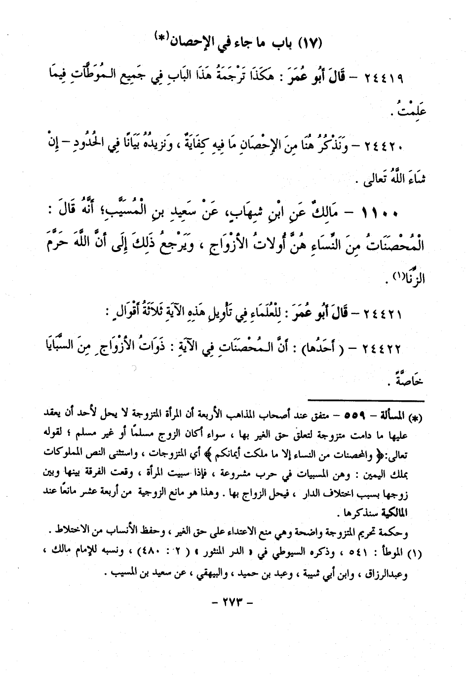 1100 - مَالِكٌ عَنِ ابْنِ شِهَابٍ، عَنْ سَعِيدِ بْنِ الْمُسَيَّبِ ; أَنَّهُ قَالَ: الْمُحْصَنَاتُ مِنَ النِّسَاءِ هُنَّ أُولَاتُ الْأَزْوَاجِ، وَيَرْجِعُ ذَلِكَ إِلَى أَنَّ اللَّهَ حَرَّمَ الزِّنَا.