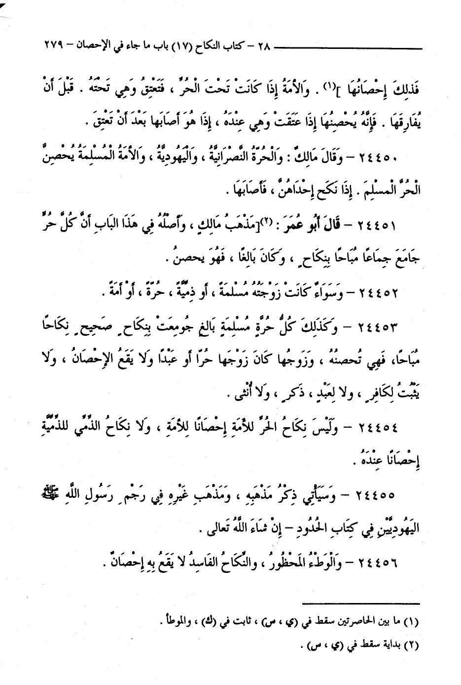 24454 - وَلَيْسَ نِكَاحُ الْحُرِّ لِلْأَمَةِ إِحْصَانًا لِلْأَمَةِ، وَلَا نِكَاحُ الذِّمِّيِّ لِلذِّمِّيَّةِ إِحْصَانًا عِنْدَهُ.