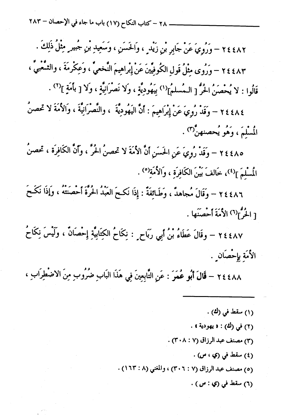 24483 - وَرُوِيَ مِثْلُ قَوْلِ الْكُوفِيِّينَ عَنْ إِبْرَاهِيمَ النَّخَعِيِّ، وَعِكْرِمَةَ، وَالشَّعْبِيِّ، قَالُوا: لَا يُحَصَّنُ الْحُرُّ الْمُسْلِمُ بِيَهُودِيَّةٍ، وَلَا نَصْرَانِيَّةٍ، وَلَا بِأَمَةٍ.