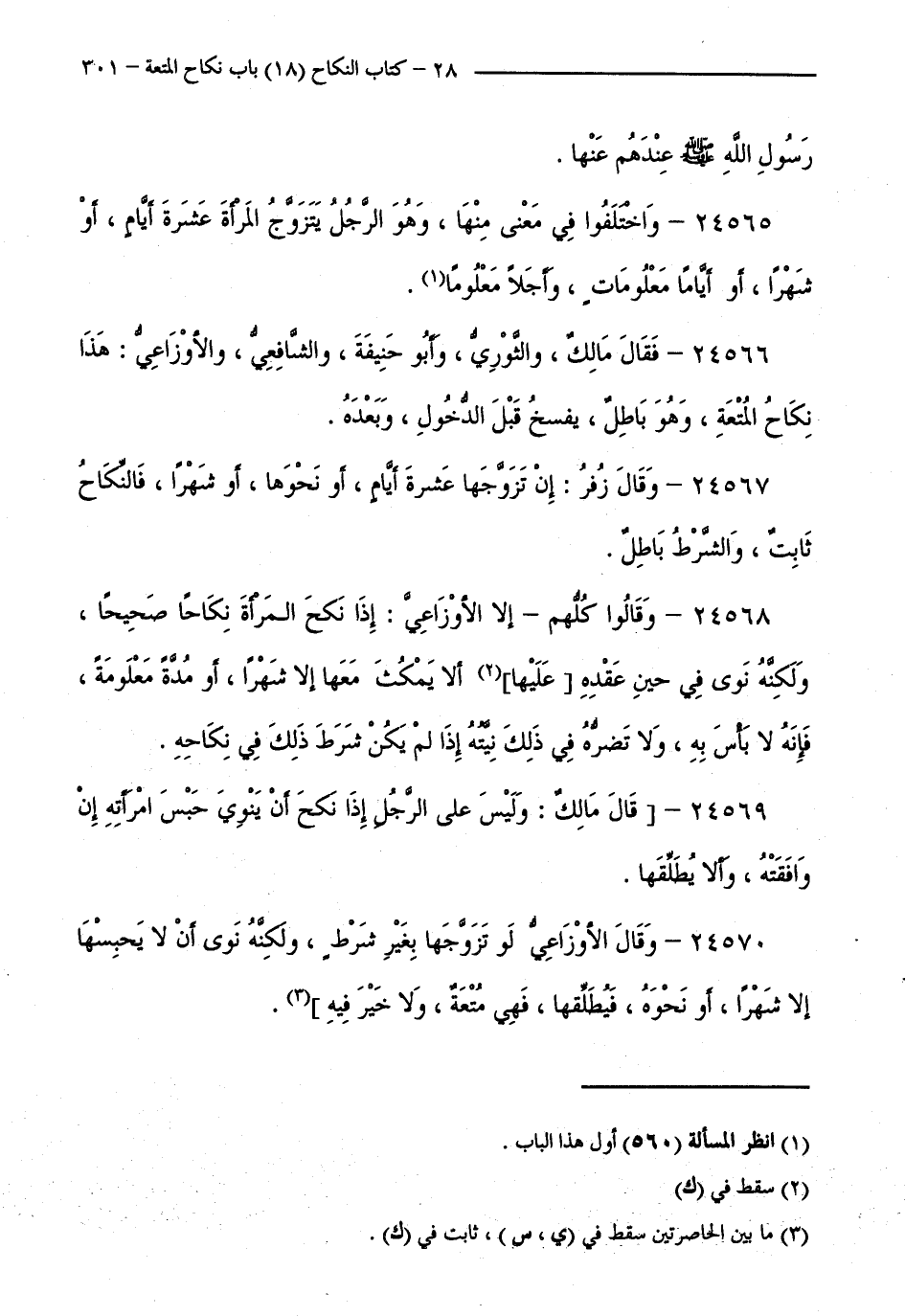 24566 - فَقَالَ مَالِكٌ، وَالثَّوْرِيُّ، وَأَبُو حَنِيفَةَ، وَالشَّافِعِيُّ، وَالْأَوْزَاعِيُّ: هَذَا نِكَاحُ الْمُتْعَةِ، وَهُوَ بَاطِلٌ، يُفْسَخُ قَبْلَ الدُّخُولِ، وَبَعْدَهُ.