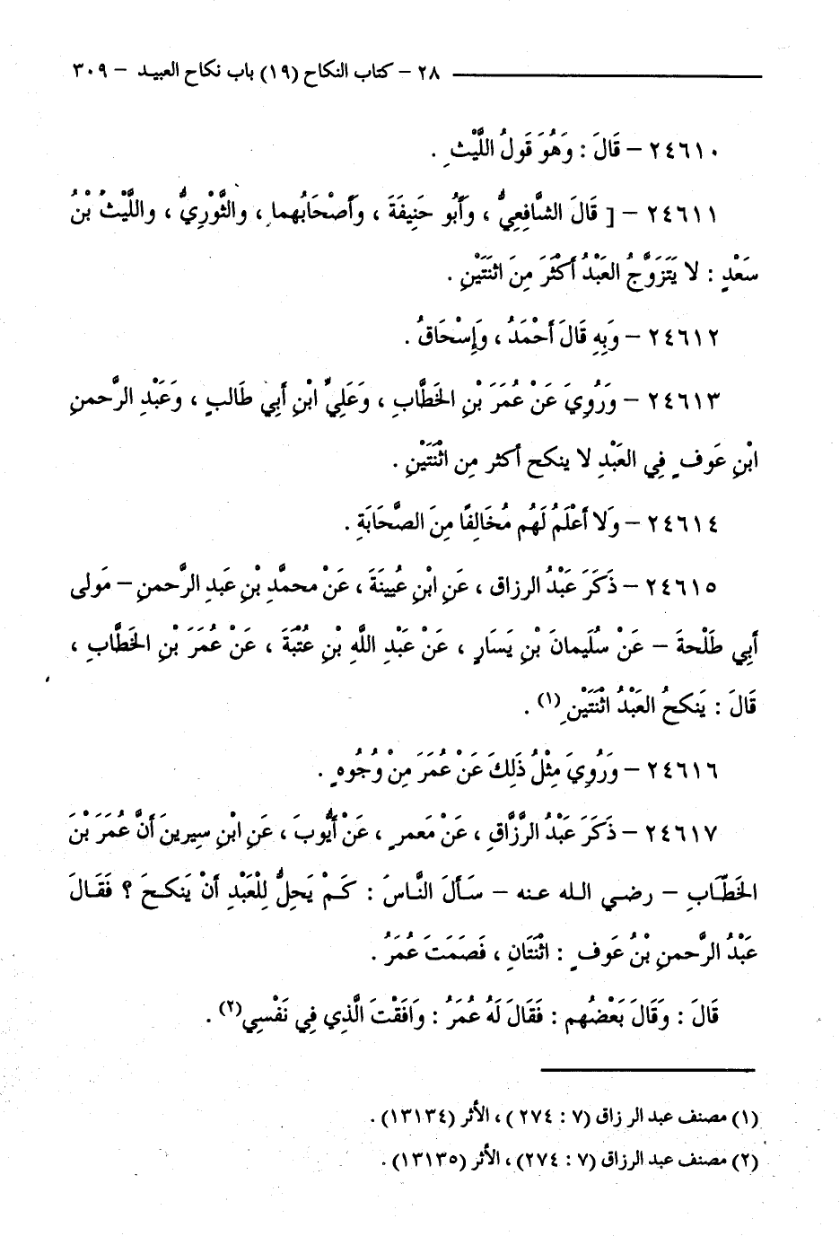 24615 - ذَكَرَ عَبْدُ الرَّزَّاقِ، عَنِ ابْنِ عُيَيْنَةَ، عَنْ مُحَمَّدِ بْنِ عَبْدِ الرَّحْمَنِ - مَوْلَى أَبِي طَلْحَةَ - عَنْ سُلَيْمَانَ بْنِ يَسَارٍ، عَنْ عَبْدِ اللَّهِ بْنِ عُتْبَةَ، عَنْ عُمَرَ بْنِ الْخَطَّابِ، قَالَ: يَنْكِحُ الْعَبْدُ اثْنَتَيْنِ.